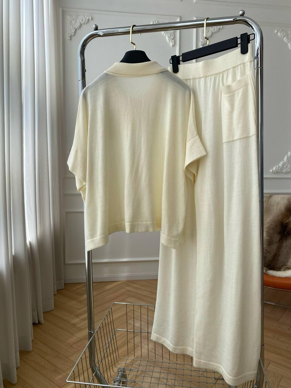 Костюм женский Brunello Cucinelli LUX-110170 представляет собой элегантный комплект кремового цвета, включающий в себя рубашку поло и широкие брюки. Этот костюм выполнен в современном стиле, идеально подходящем для создания стильных повседневных образов.