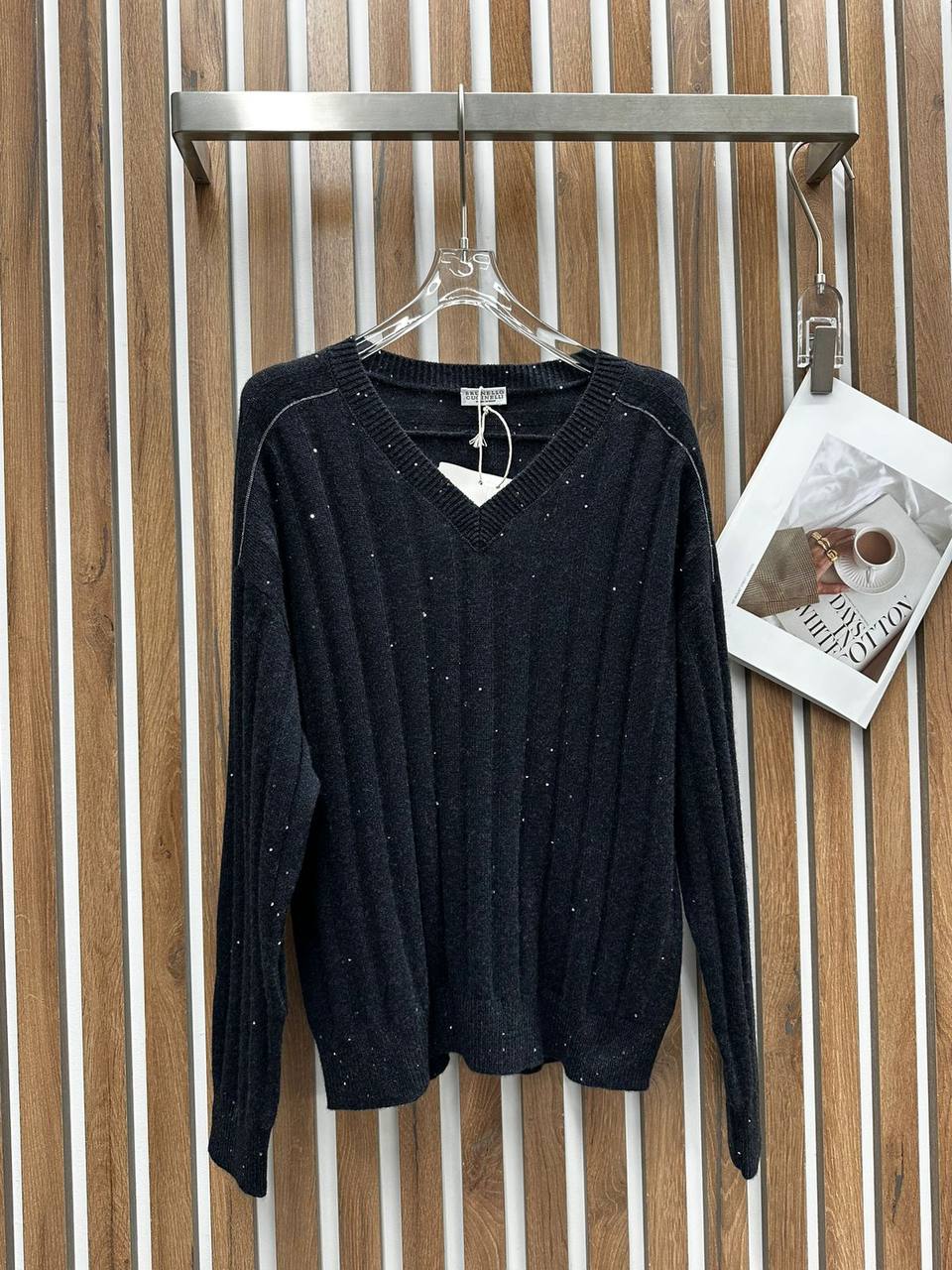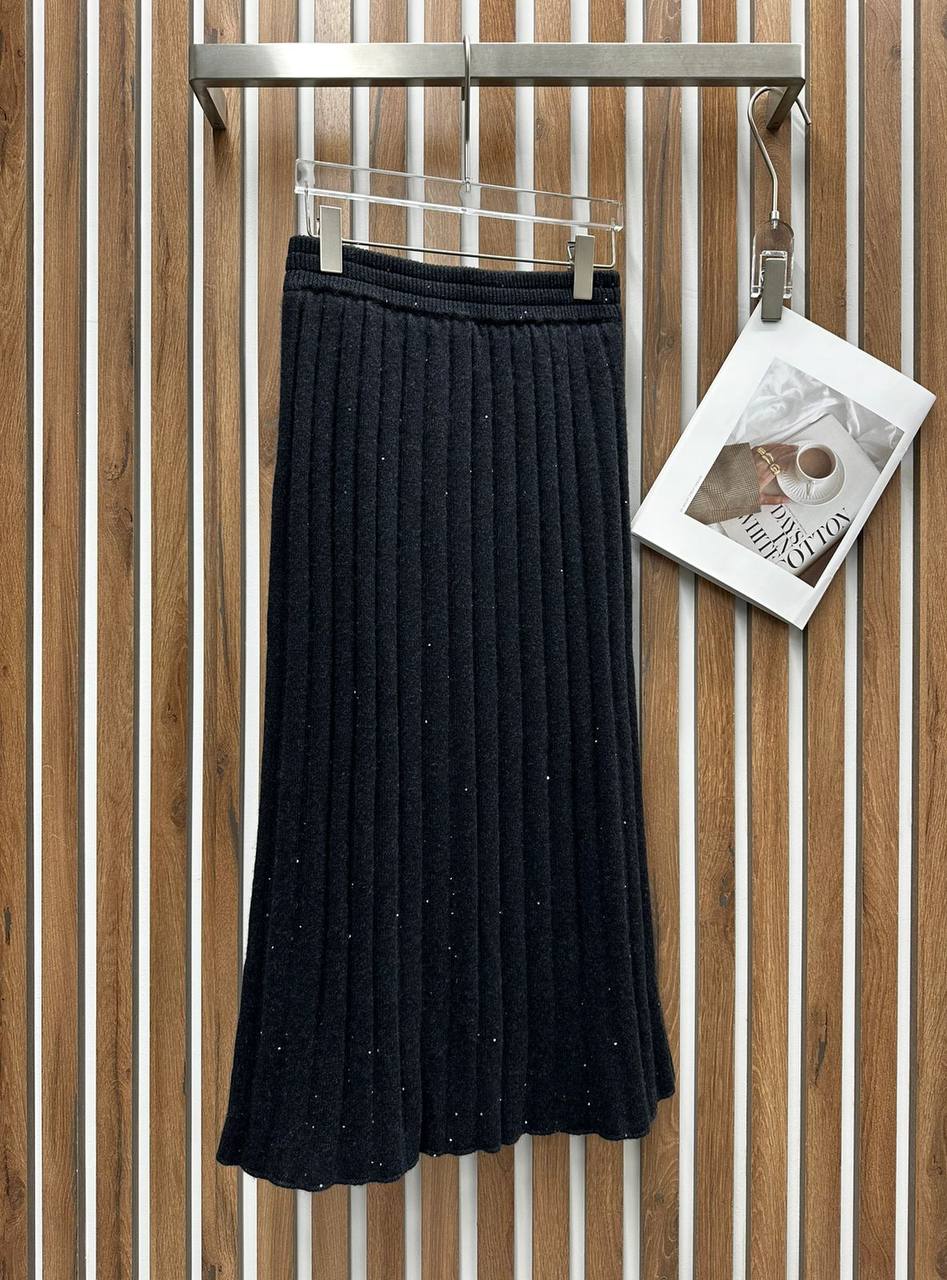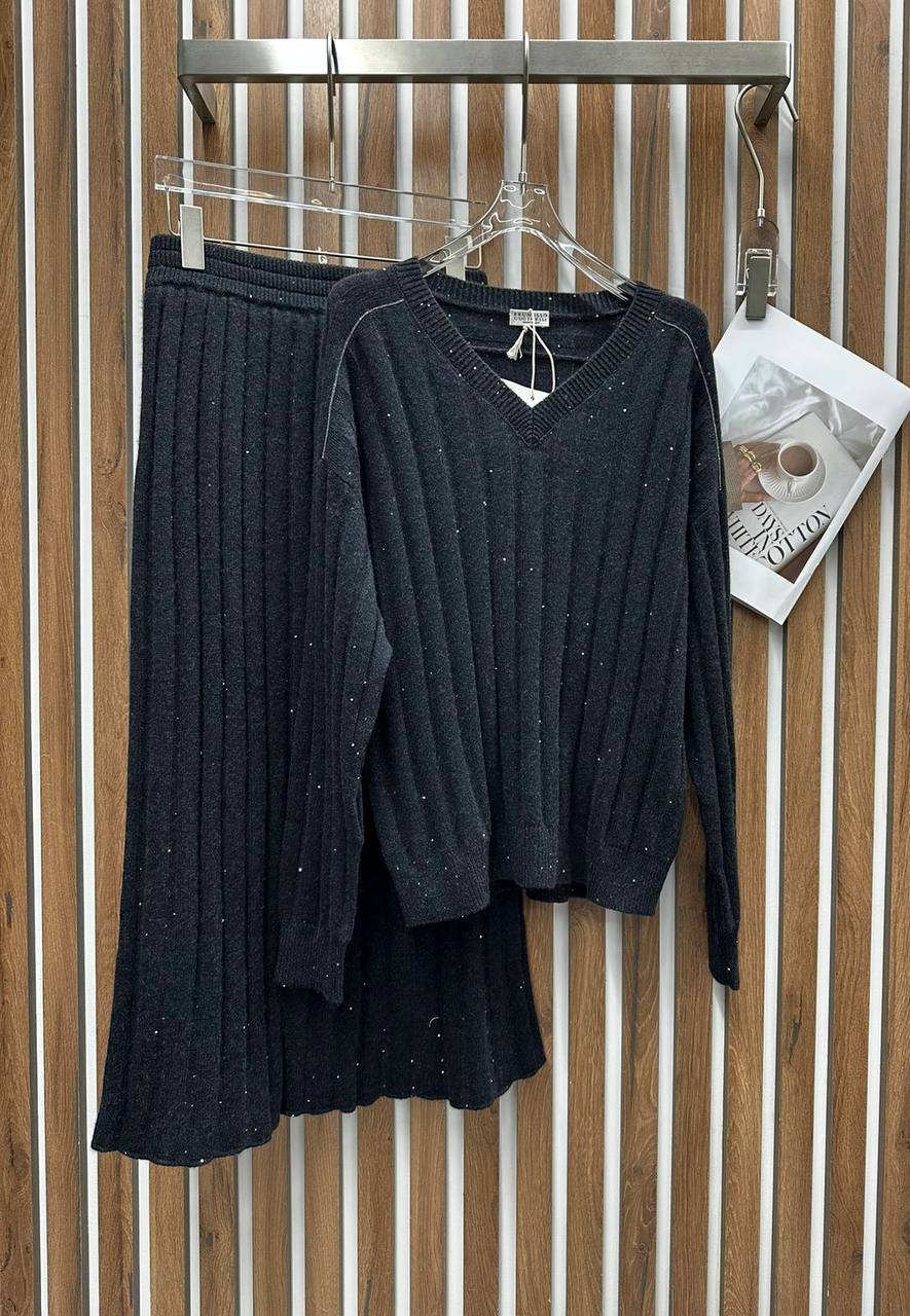 Костюм женский Brunello Cucinelli LUX-111590 представляет собой элегантный комплект, выполненный в современном стиле. Костюм состоит из кофты с V-образным вырезом и юбки. Темно-серый оттенок изделия придает ему универсальность, а текстура – изысканность.