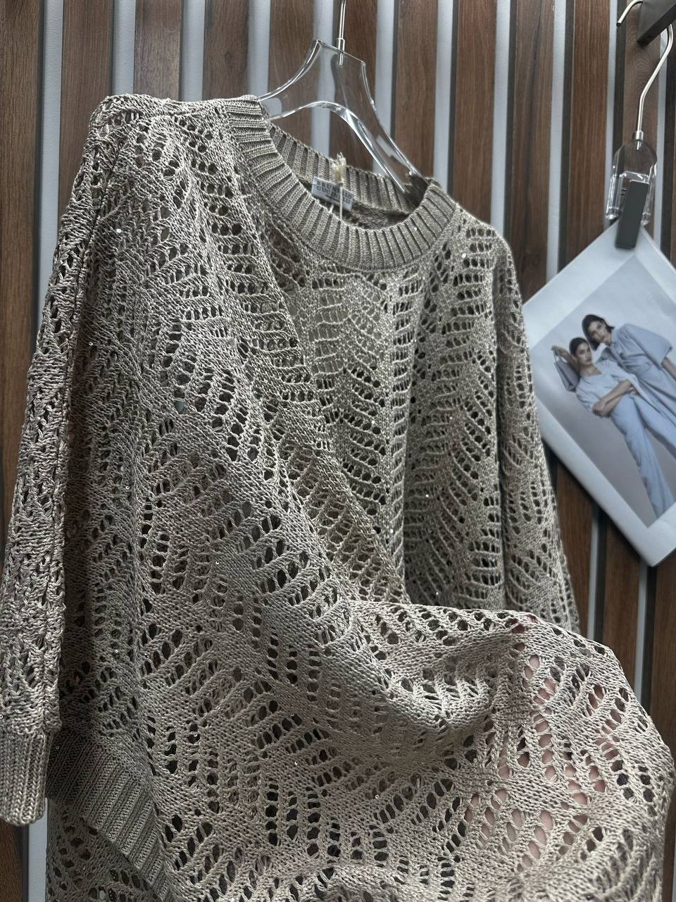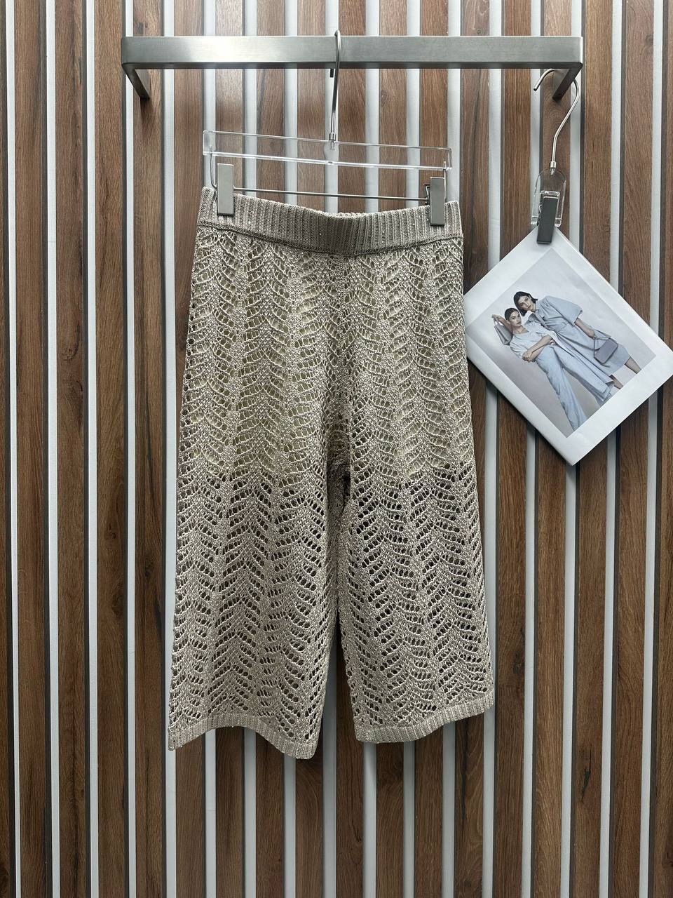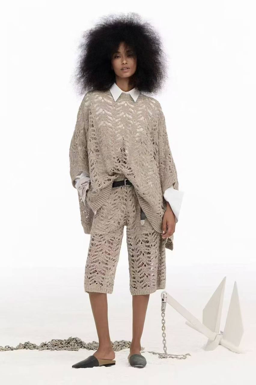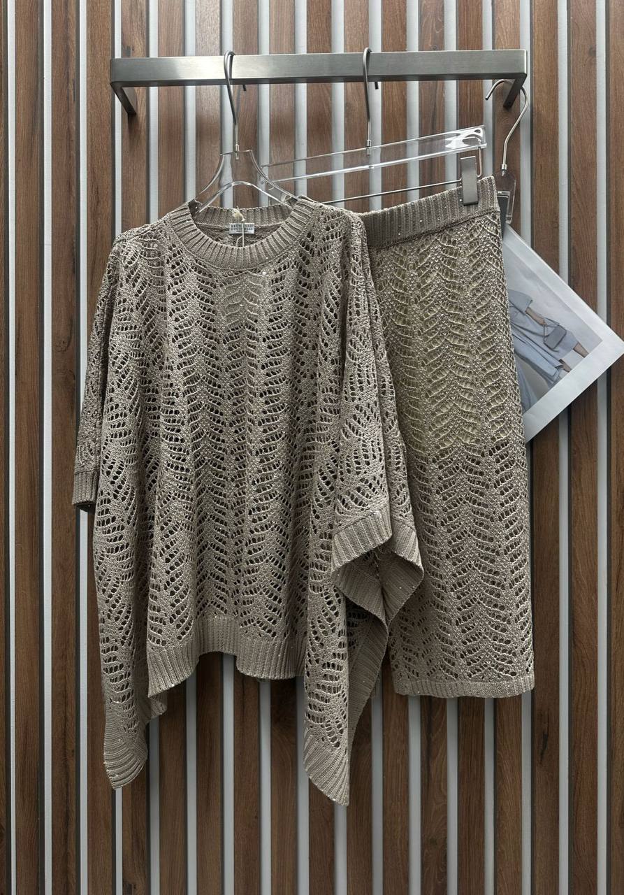 Костюм женский Brunello Cucinelli LUX-116038 представляет собой комплект одежды свободного кроя. Этот костюм в нейтральном бежевом цвете, имеет открытую структуру вязки, что придает ему легкость и воздушность. Идеально подходит для создания стильного и расслабленного образа.
