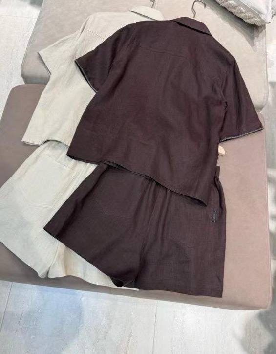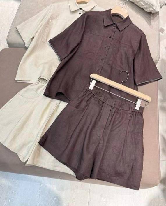 Костюм женский Brunello Cucinelli LUX-116464, представленный на изображении, представляет собой стильный ансамбль для летнего гардероба. Костюм состоит из рубашки с коротким рукавом и шорт, выполненных в элегантном коричневом цвете. Этот костюм подходит для создания как повседневных, так и более элегантных образов.