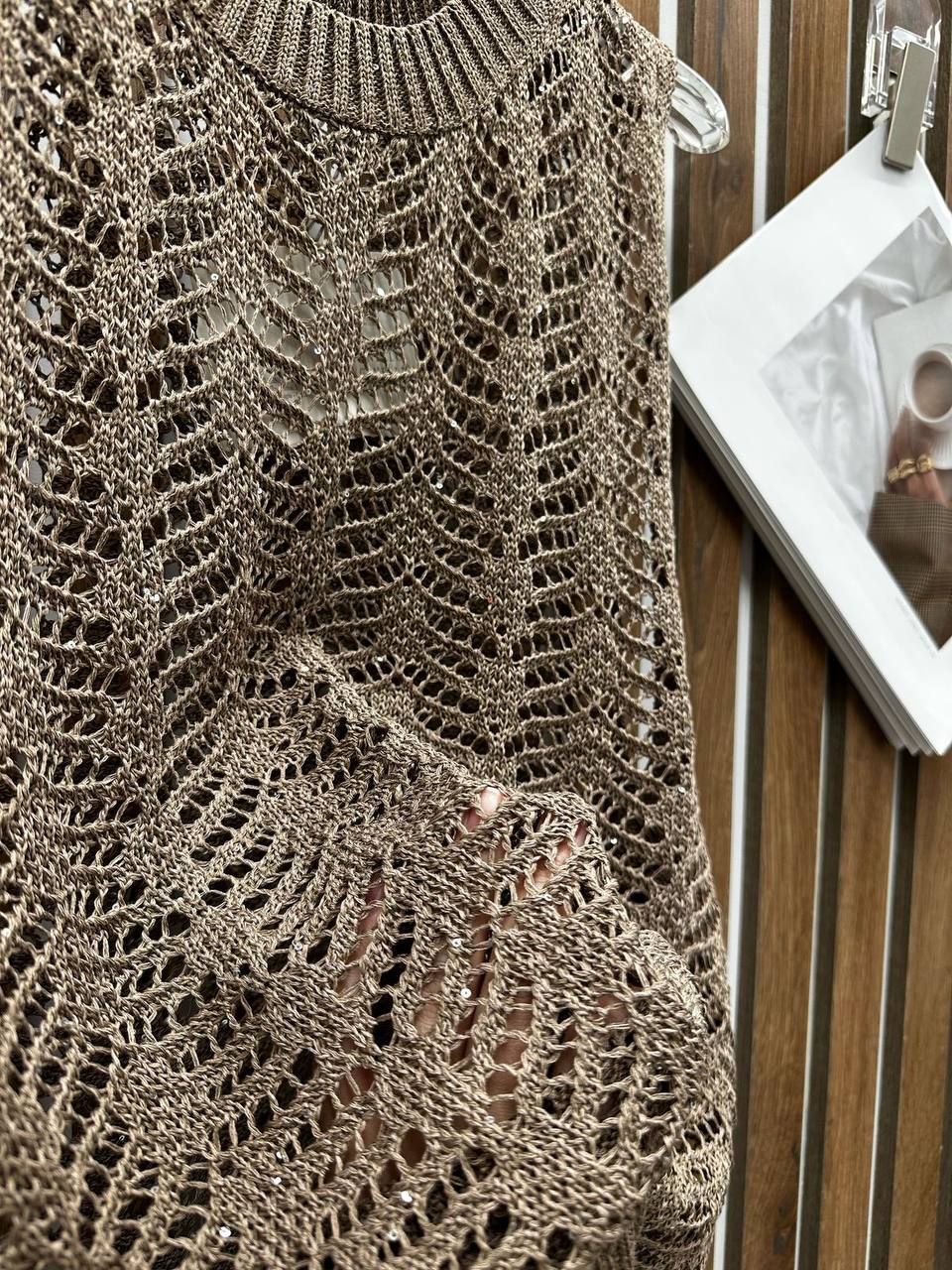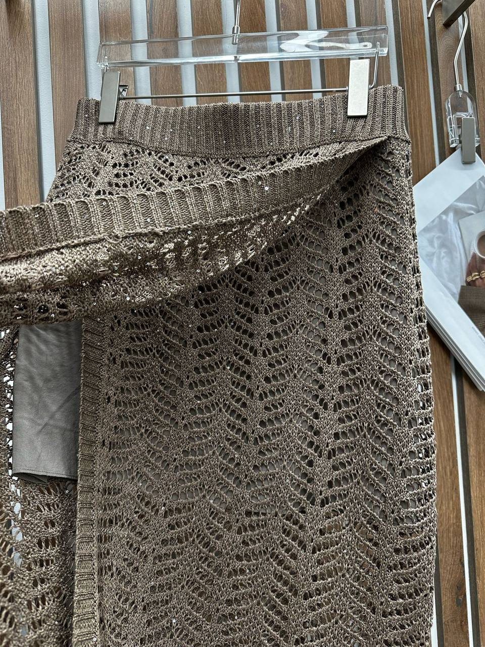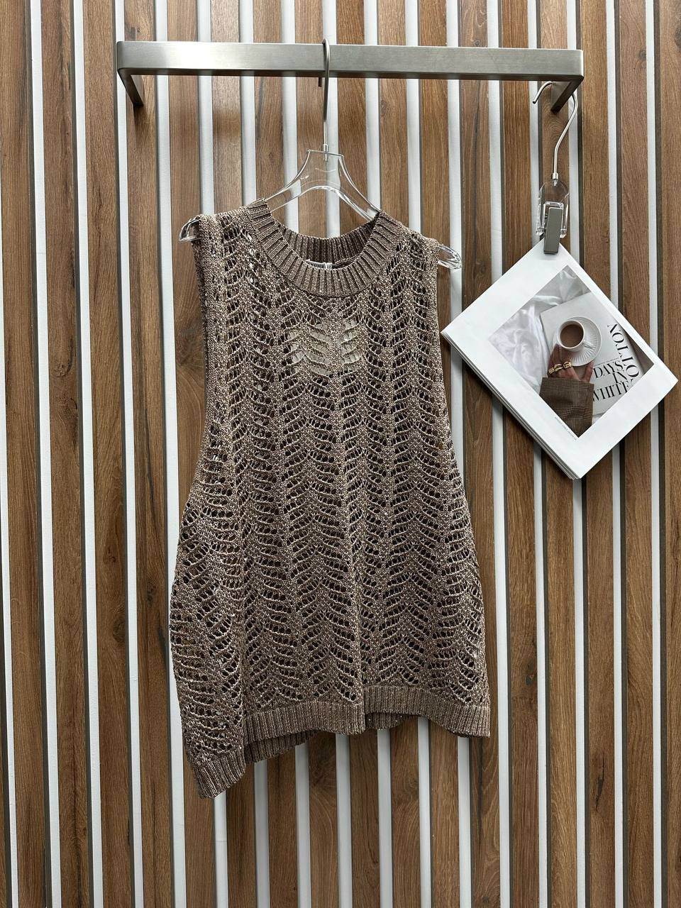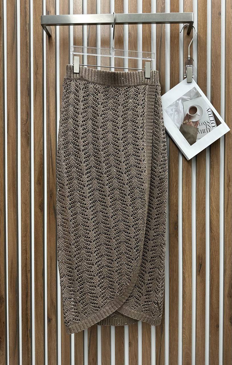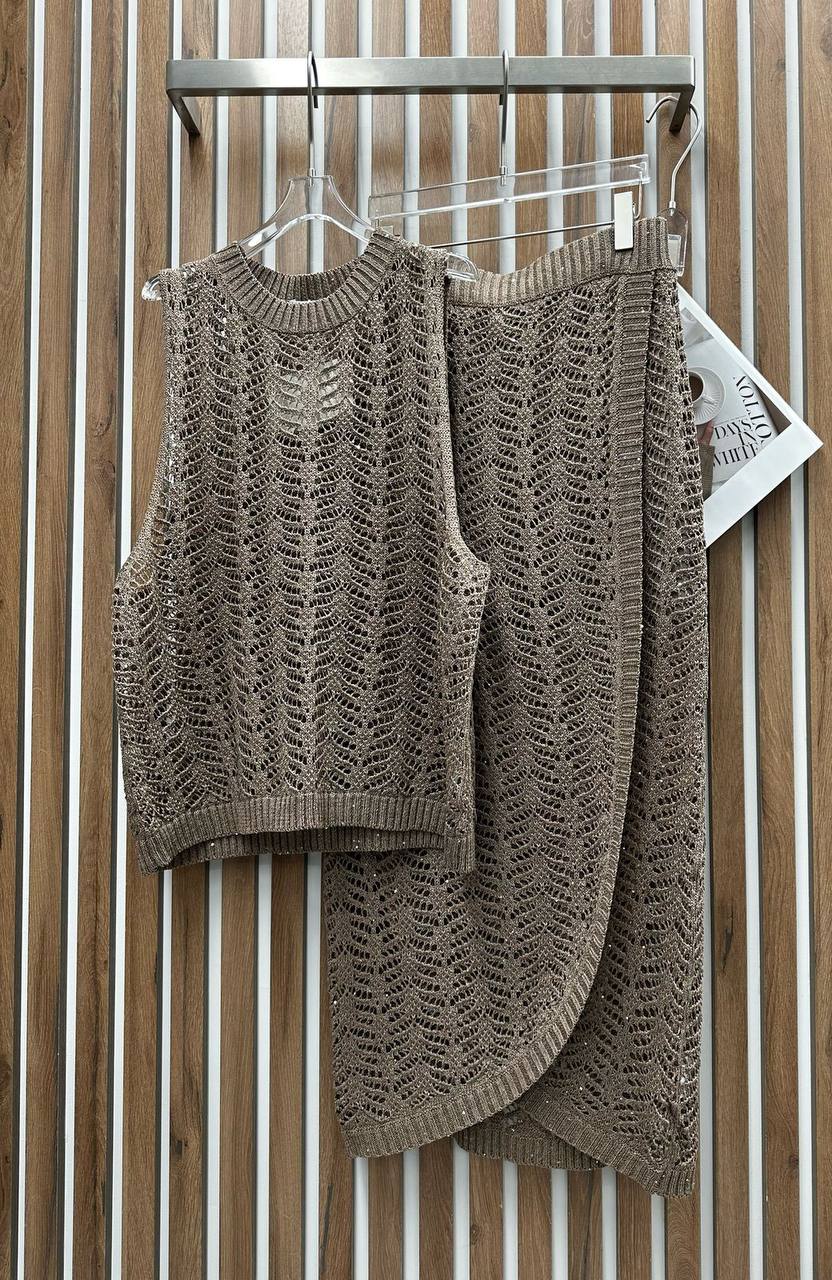 Костюм женский Brunello Cucinelli LUX-117826 представляет собой стильный комплект, состоящий из топа без рукавов и юбки. Комплект выполнен в теплом коричневом оттенке с ажурным узором, придающим ему изысканный вид. Такой костюм может быть идеальным выбором для создания элегантных и легких образов в весенне-летний период.