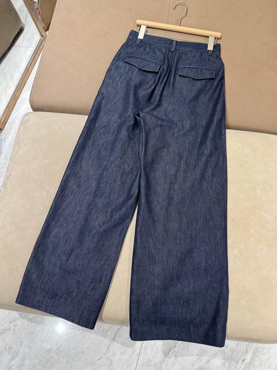 Brunello Cucinelli представляет стильный женский костюм из денима. Костюм включает в себя брюки широкого кроя и жакет с поясом, выполненный в темно-синем цвете.
