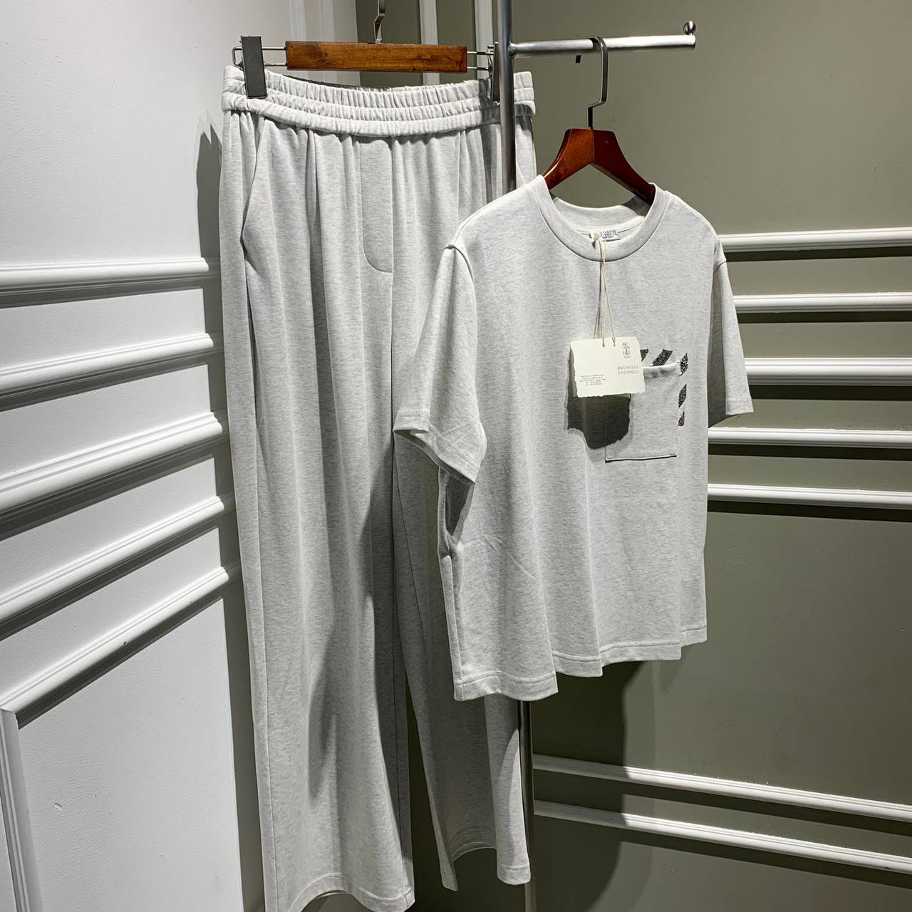 Костюм женский Brunello Cucinelli LUX-72306 – это стильный и комфортный ансамбль в спортивном стиле. Комплект, состоящий из футболки и брюк, выполнен в сером цвете, что делает его универсальным для различных образов. Текстура ткани приятная на ощупь, а свободный крой обеспечивает свободу движений.