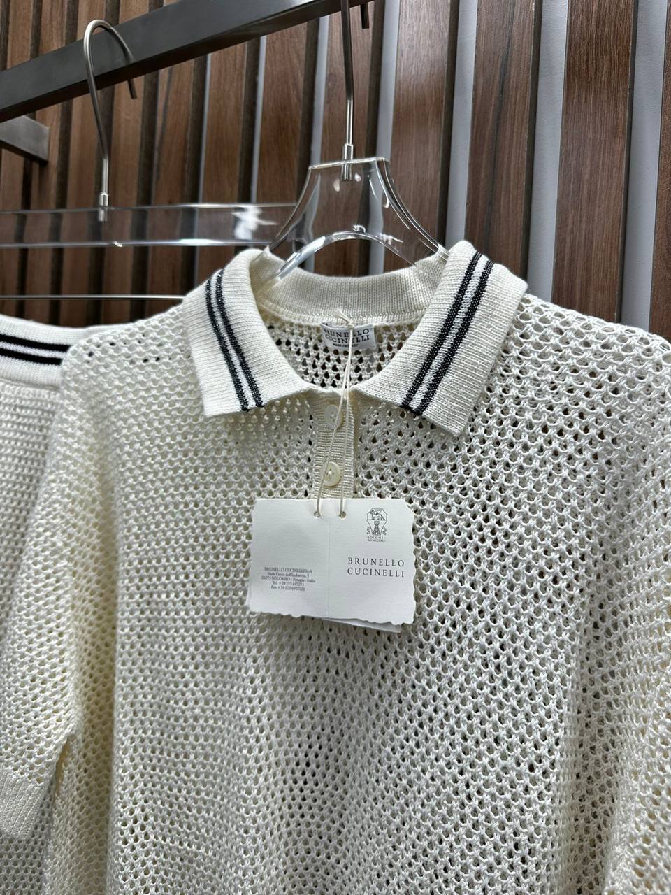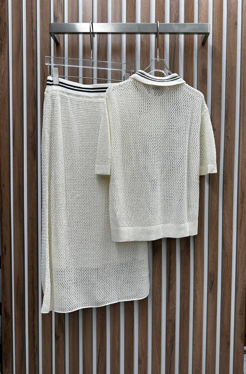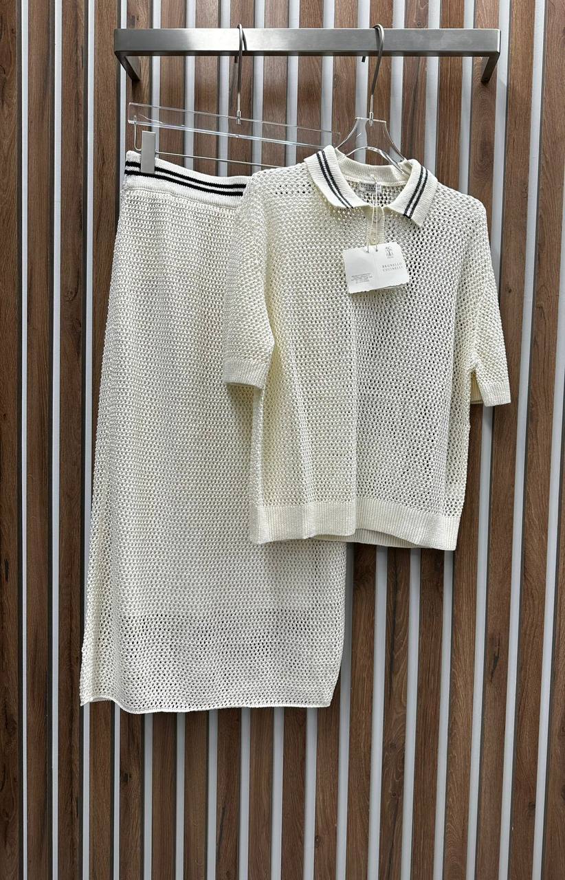 Костюм женский Brunello Cucinelli LUX-92768, представленный на изображении, – это изысканный комплект, сочетающий в себе элегантность и комфорт. Костюм выполнен в кремовом оттенке, который придает ему легкость и свежесть, с добавлением темных полос на воротнике и поясе юбки для контраста. Он идеально подходит для создания стильных летних образов.