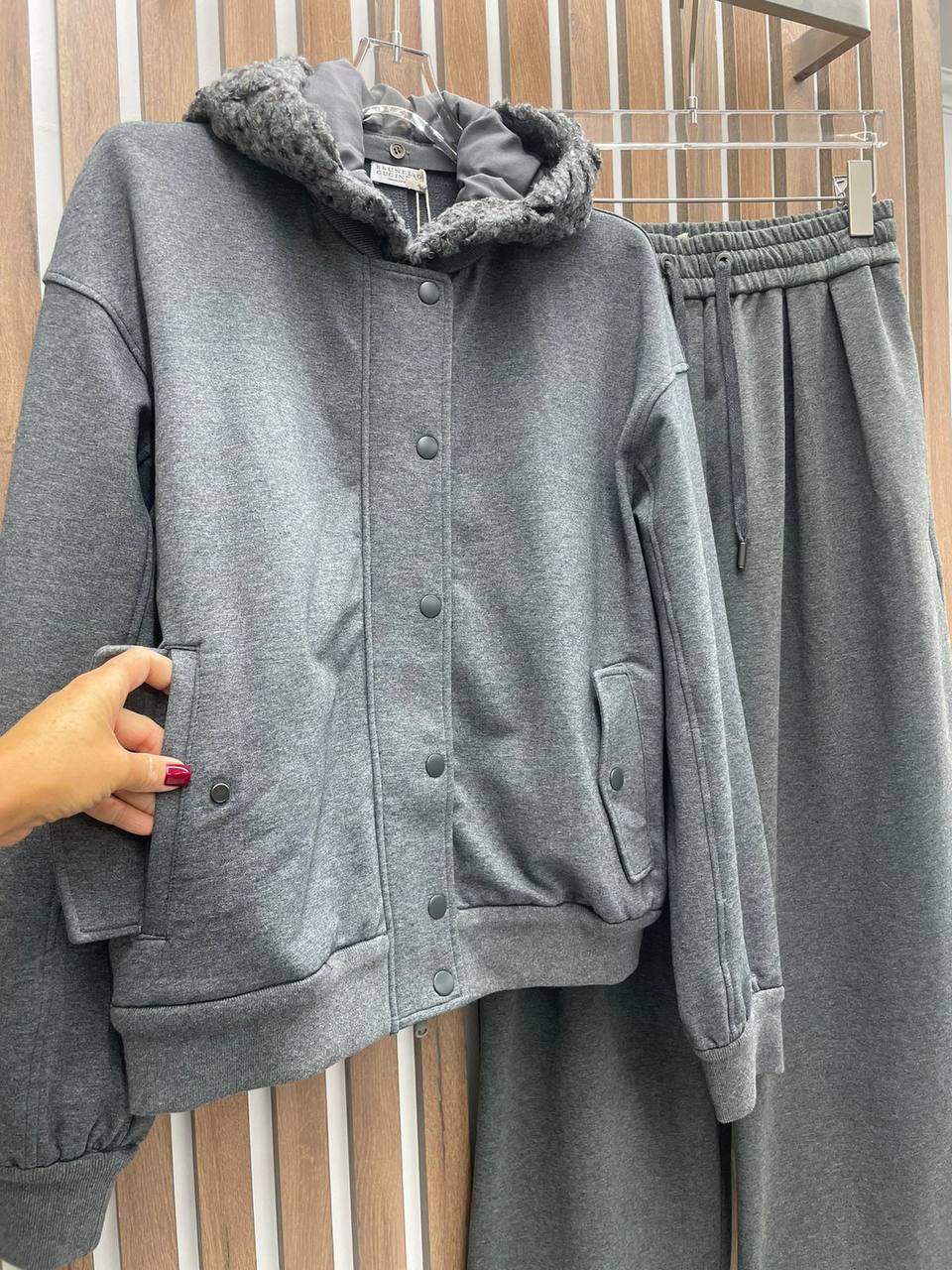 Костюм женский Brunello Cucinelli LUX-97951 — это стильный и комфортный ансамбль, выполненный в повседневном стиле. Комплект состоит из свободной куртки на кнопках с капюшоном и брюк. Серый цвет костюма придает ему элегантность и универсальность, позволяя легко сочетать его с различными элементами гардероба.