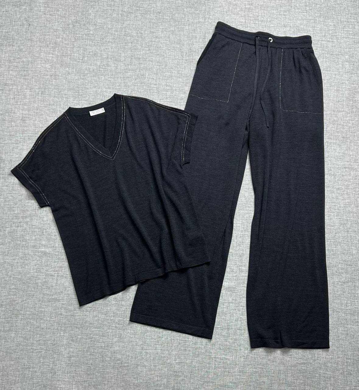 Костюм женский Brunello Cucinelli LUX-104215 представляет собой элегантный ансамбль, состоящий из футболки с V-образным вырезом и свободных брюк. Комплект выполнен в классическом черном цвете, идеально подходящем для создания повседневных и стильных образов. Данный костюм воплощает в себе итальянский стиль, сочетая комфорт и изысканность.
