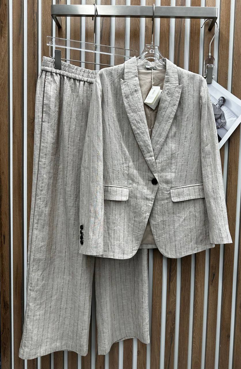 Костюм женский Brunello Cucinelli LUX-104321 — это элегантный костюм, выполненный в деловом стиле, в песочных тонах с тонкими вертикальными полосками. Костюм состоит из пиджака и брюк прямого кроя, что придает образу строгость и изысканность. Идеальный выбор для создания стильного и утонченного образа.