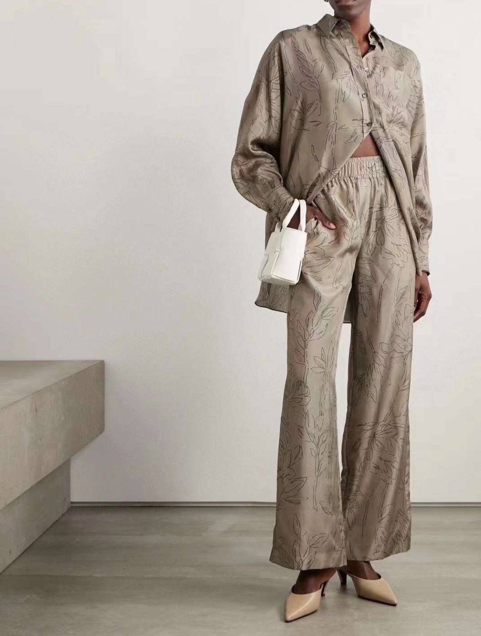 Костюм женский Brunello Cucinelli LUX-105532 – элегантный комплект, состоящий из рубашки и брюк свободного кроя. Костюм выполнен в спокойных тонах с растительным принтом, что добавляет ему изысканности. Этот костюм подойдет для создания стильных и комфортных образов.
