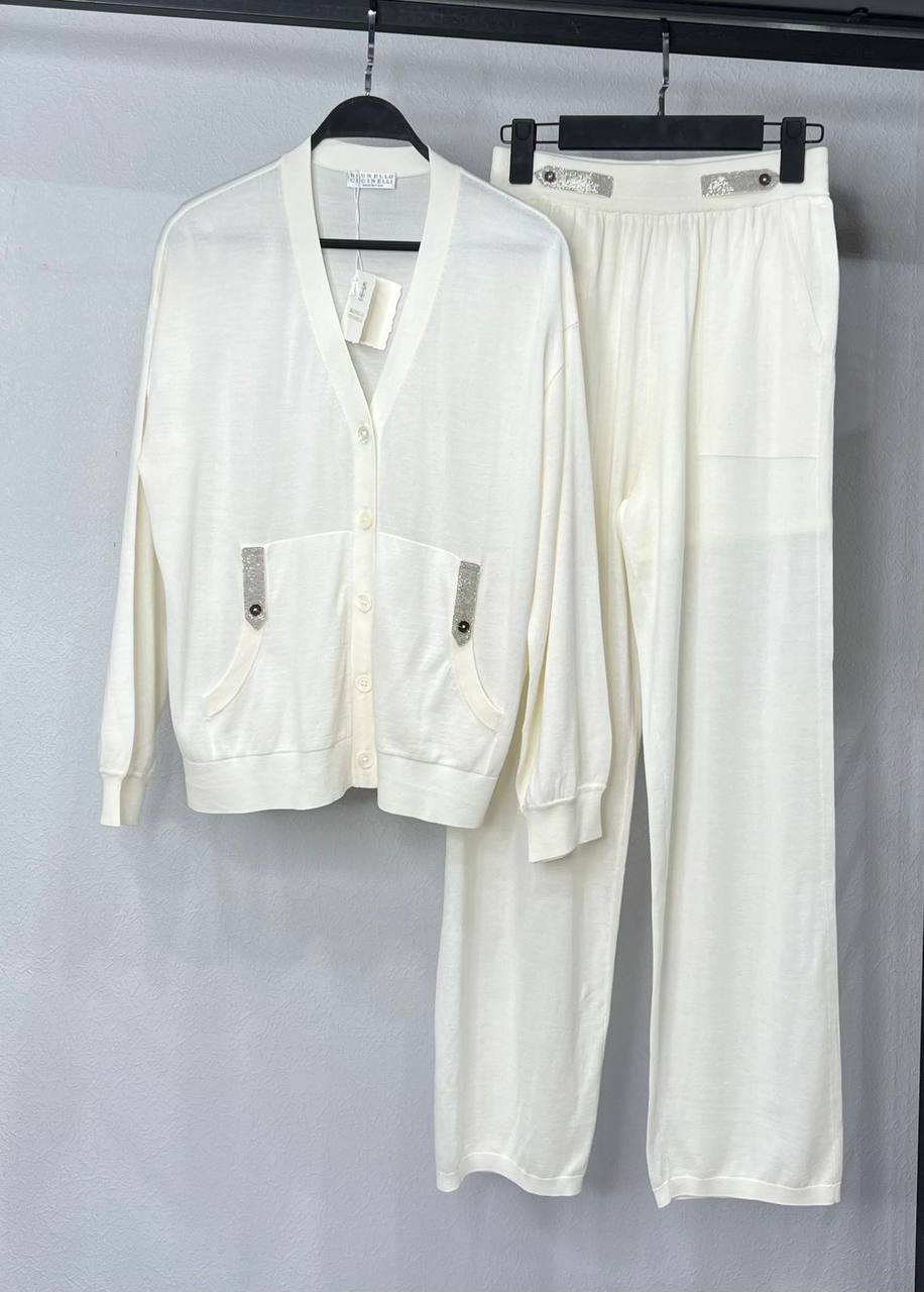 Женский костюм Brunello Cucinelli LUX-105732 представляет собой элегантный комплект из кардигана и брюк. Комплект выполнен в кремовом оттенке, который придает изделию изысканный вид. Текстура ткани мягкая и приятная на ощупь, что обеспечивает комфорт при носке. Этот костюм идеально подойдет для создания повседневных образов.