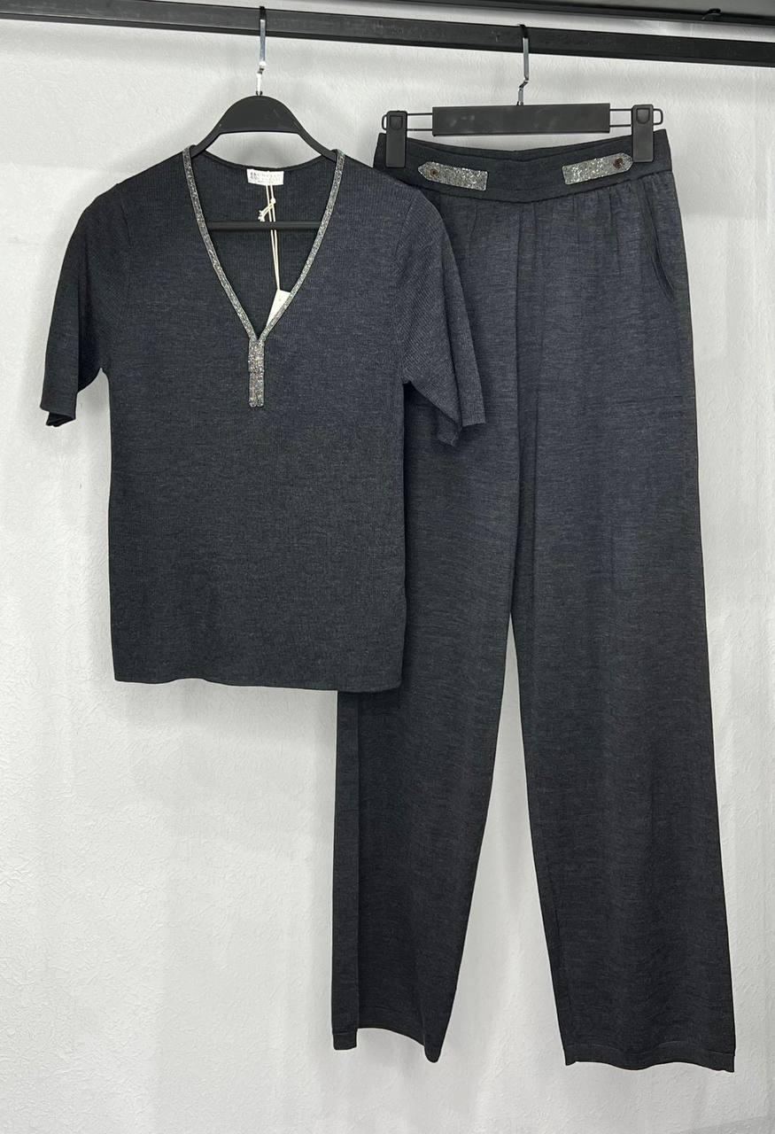 Костюм женский Brunello Cucinelli LUX-105733 - это стильный комплект, который состоит из футболки с короткими рукавами и брюк прямого кроя. Костюм выполнен в темно-сером цвете, что делает его универсальным для различных образов. Детали в виде декоративных элементов добавляют изысканности.