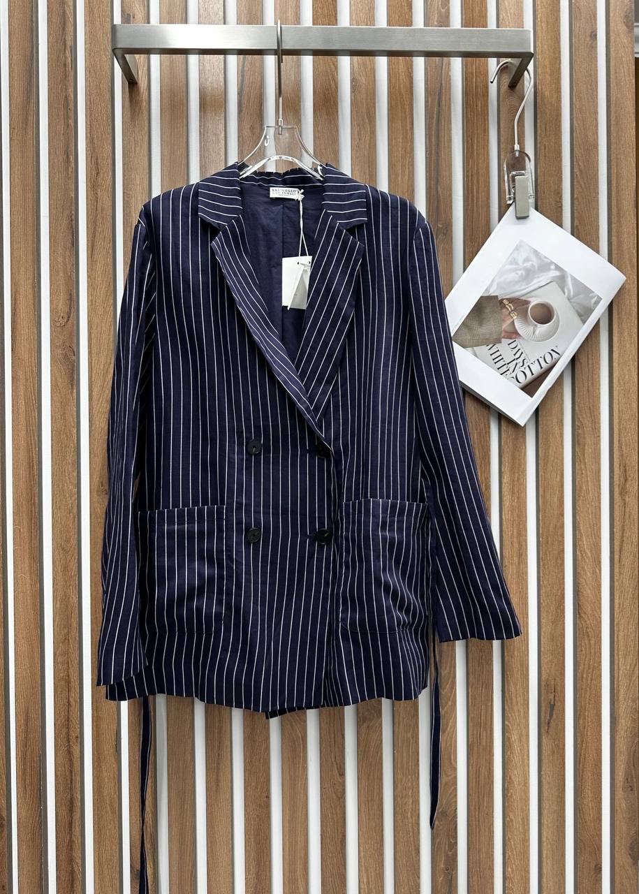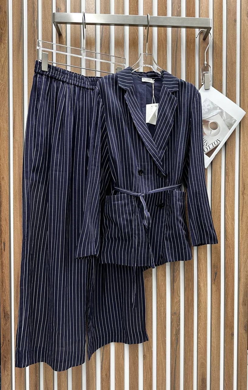 Костюм женский Brunello Cucinelli LUX-106987 — это элегантный костюм в полоску, который станет отличным выбором для создания стильного образа. Комплект состоит из пиджака и брюк, выполненных в темно-синем цвете с белыми тонкими полосами. Костюм подходит для офиса, деловых встреч или создания повседневных образов.
