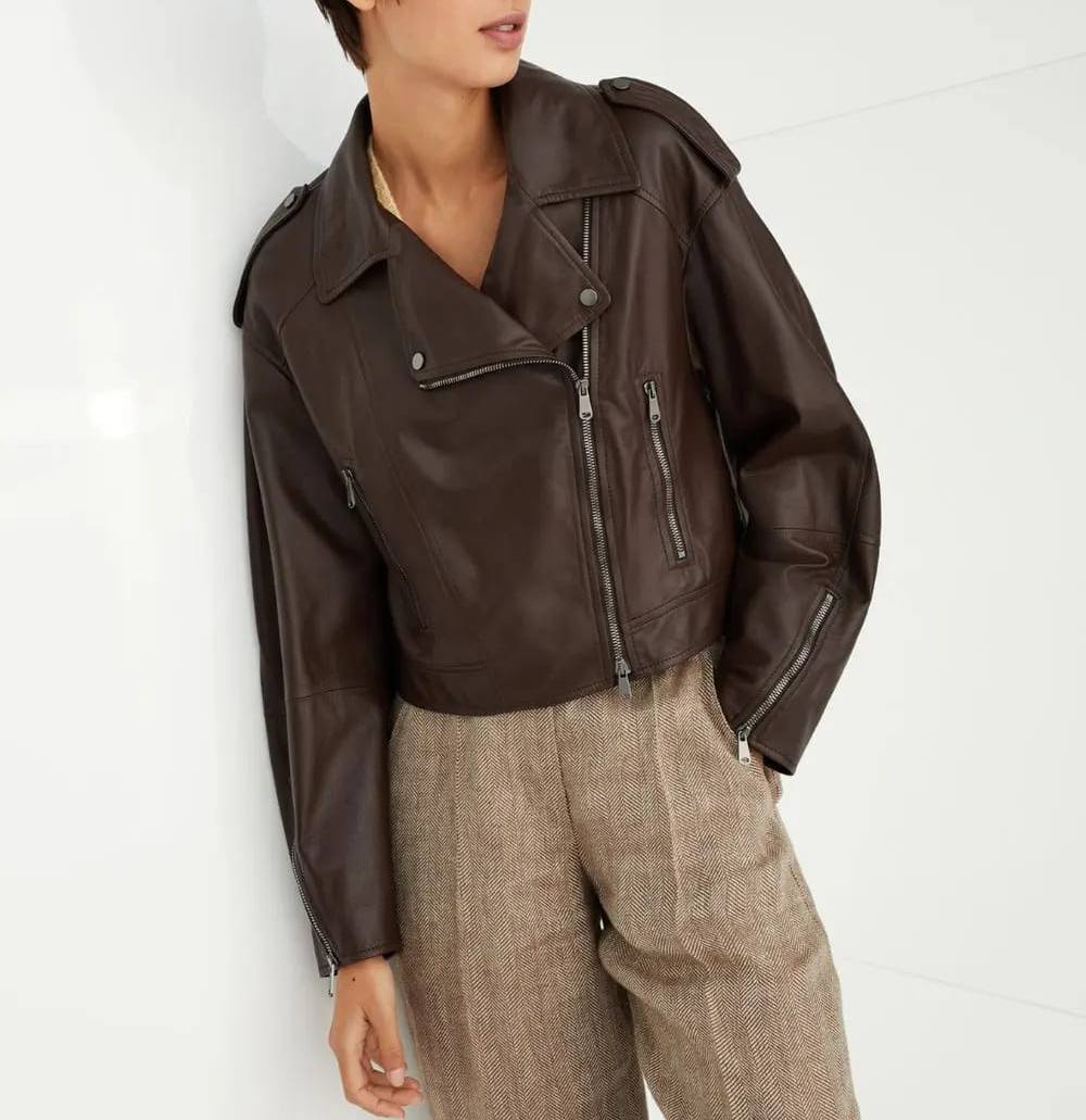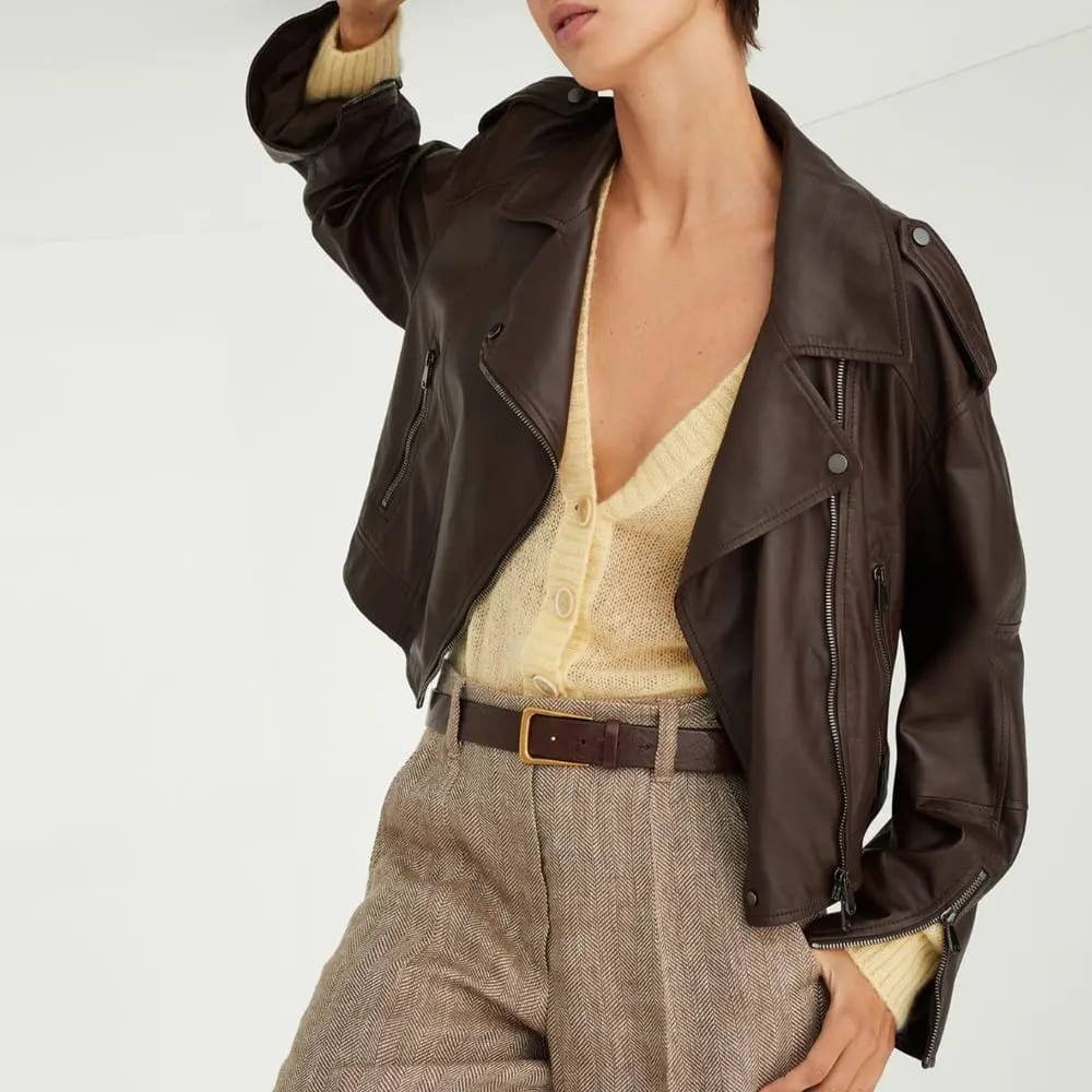 Кожаная куртка Brunello Cucinelli LUX-110727 - это элегантная модель в стиле косухи, выполненная в насыщенном коричневом цвете. Куртка имеет гладкую текстуру, асимметричную молнию и несколько карманов, что делает ее одновременно стильной и практичной. Отлично подходит для создания образов в стиле casual и smart casual.