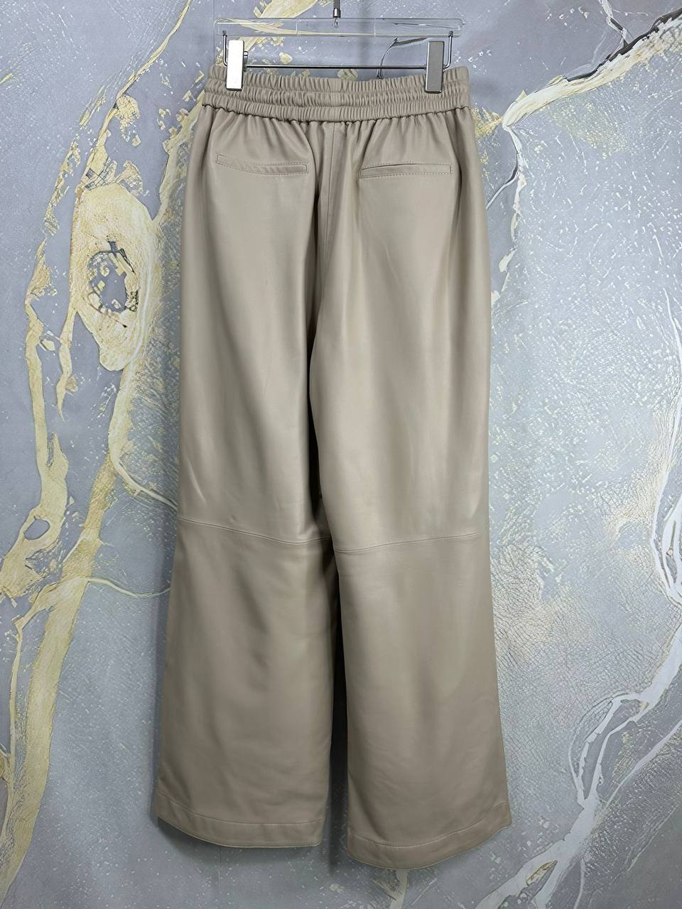 Кожаные брюки Brunello Cucinelli LUX-111278, выполнены в расслабленном стиле и имеют прямой крой. Брюки в бежевом цвете из гладкой кожи, с резинкой на талии и шнурком для регулировки посадки. Эта модель станет отличным вариантом для создания повседневных и стильных образов.