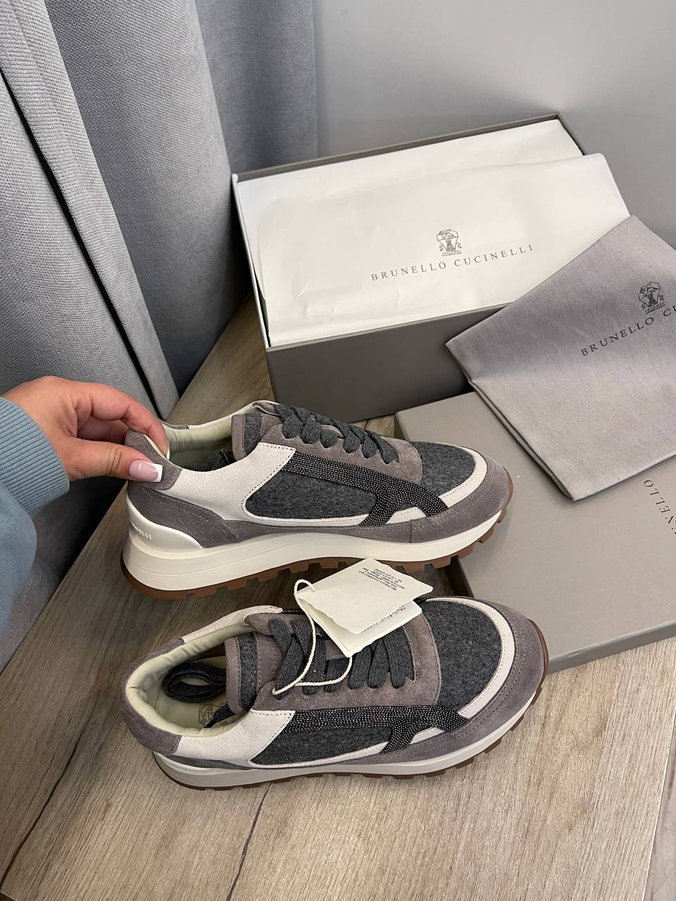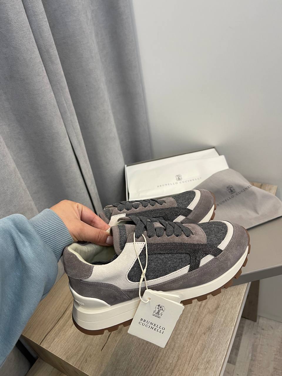 Кроссовки Brunello Cucinelli LUX-111524 представляют собой стильную модель в спортивном стиле. Кроссовки выполнены в серо-белой гамме с коричневой подошвой, сочетая различные текстуры. Их дизайн подчеркивает элегантность и комфорт.