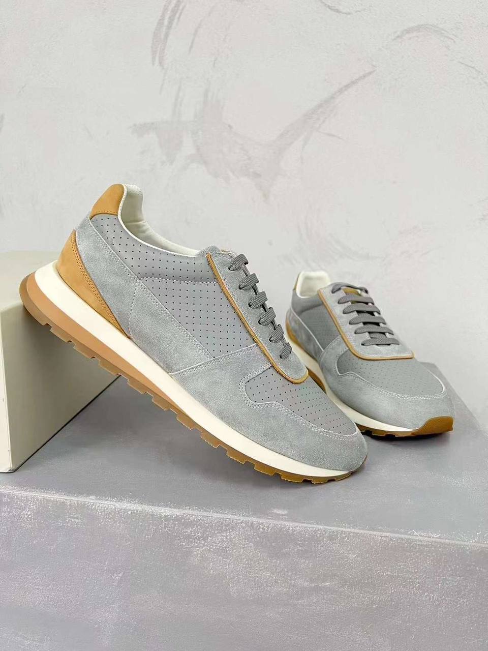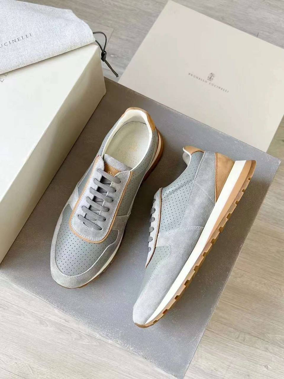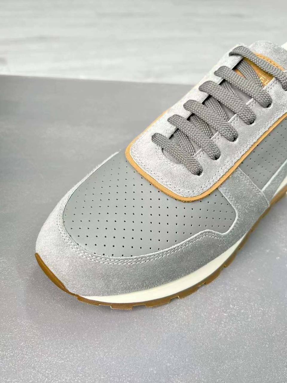 Кроссовки мужские Brunello Cucinelli LUX-91909 — это стильная обувь в спортивном стиле. Основной цвет кроссовок — серый, с элементами светло-коричневого цвета. Кроссовки имеют классический дизайн, который подойдет для повседневной носки.