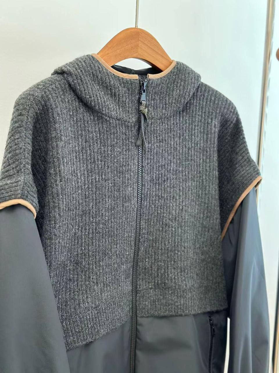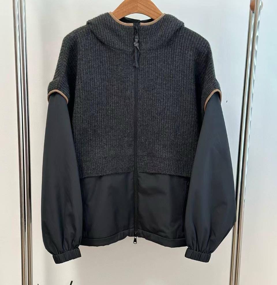 Куртка Brunello Cucinelli сочетает в себе элементы вязаного свитера и куртки, создавая уникальный и стильный образ. Это изделие выделяется своим комбинированным дизайном и высоким качеством исполнения.