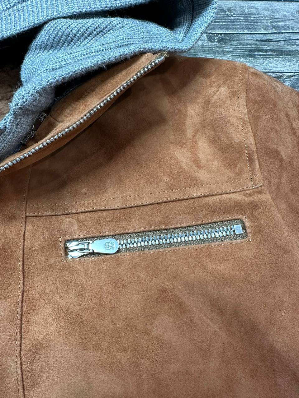 Мужская куртка Brunello Cucinelli LUX-83614 – это сочетание роскоши и утонченности. Куртка выполнена в коричневом цвете из замши с серым трикотажным капюшоном и манжетами. Модель отличается премиальным качеством и подойдет для создания стильных образов в прохладную погоду.