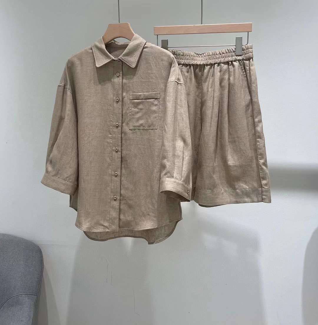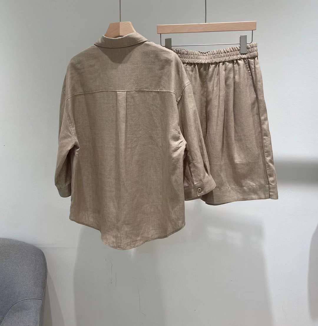 Льняной костюм Brunello Cucinelli LUX-86310 представляет собой стильный комплект, состоящий из рубашки с длинным рукавом и шорт. Костюм выполнен в нейтральном бежевом оттенке, что делает его универсальным для различных образов. Текстура ткани создает ощущение легкости и комфорта, подчеркивая летний стиль.