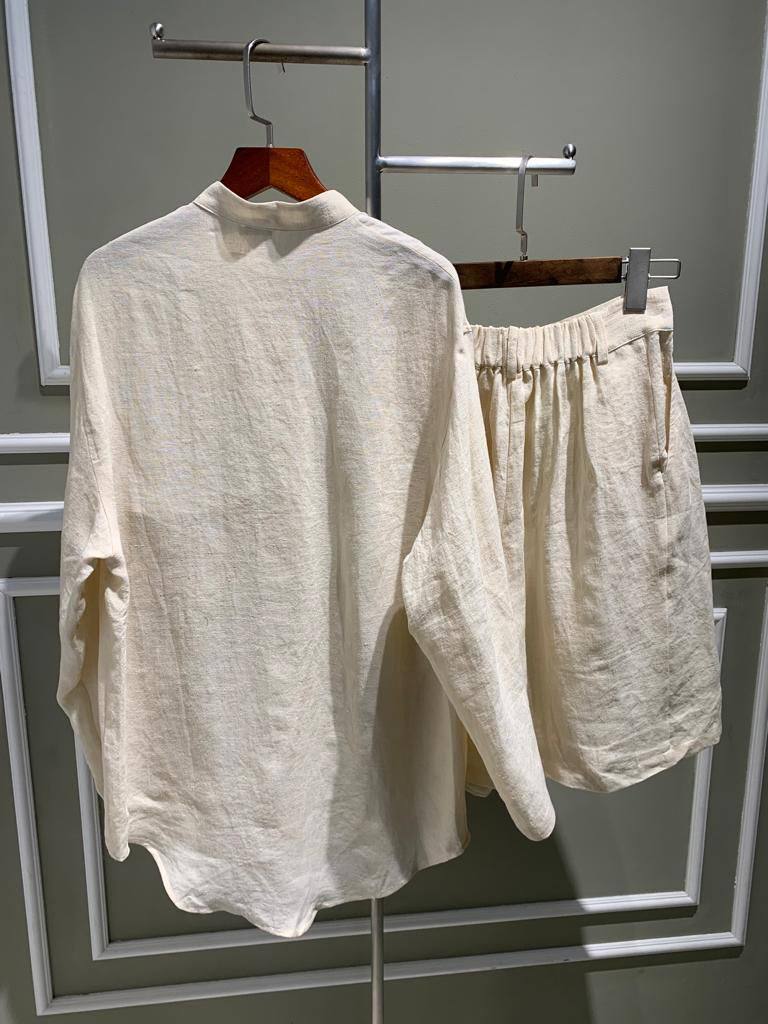Льняной костюм Brunello Cucinelli LUX-88656 - это воплощение летней элегантности и комфорта. Этот костюм состоит из рубашки с воротником-стойкой и шорт, выполненных в кремовом оттенке. Льняная ткань придает изделию расслабленный, но в то же время изысканный вид. Он идеально подойдет для создания стильного образа в жаркую погоду.