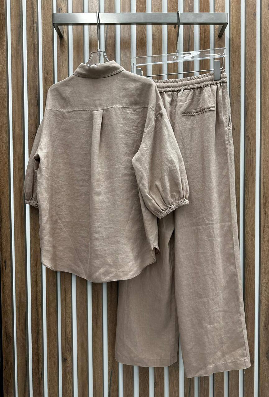 Льняной костюм Brunello Cucinelli LUX-90937 – это идеальный выбор для создания стильного и комфортного образа. Комплект состоит из рубашки с накладными карманами и свободных брюк. Костюм выполнен в нейтральном оттенке, который легко сочетается с другими элементами гардероба.