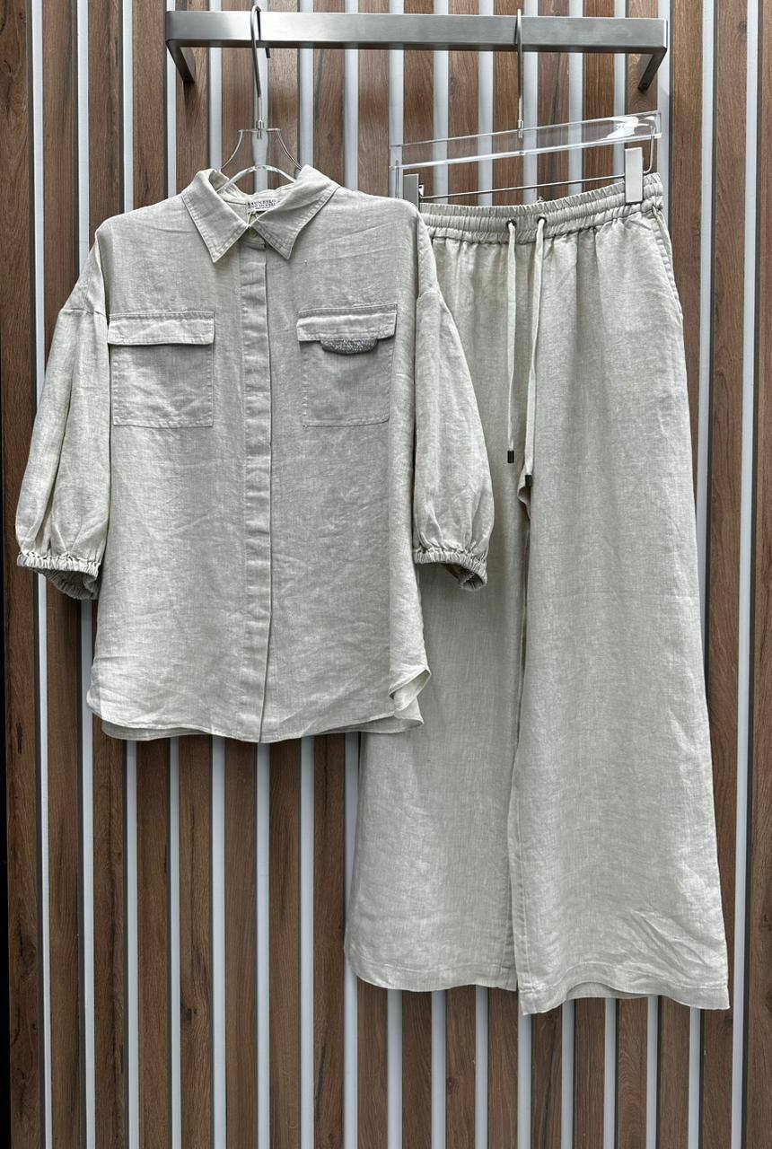 Льняной костюм Brunello Cucinelli LUX-90938 — это элегантный ансамбль, состоящий из рубашки с длинным рукавом и брюк свободного кроя. Костюм выполнен в нейтральном оттенке, который подчеркивает естественную текстуру льна. Идеально подойдет для создания стильного и комфортного образа.