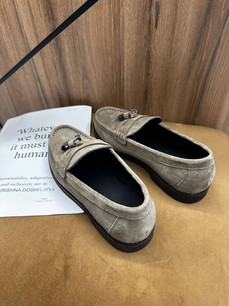 Лоферы Brunello Cucinelli LUX-117757 - это элегантная обувь в классическом стиле, выполненная в нейтральном сером цвете. Они имеют характерную текстуру замши и лаконичный дизайн, подходящий для различных образов. Лоферы прекрасно дополнят как повседневный, так и деловой гардероб.