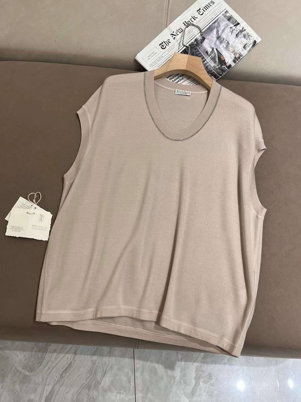 Майка Brunello Cucinelli LUX-104126, представленная на изображении, является воплощением элегантности и минимализма. Эта модель выполнена в нейтральном цвете, что делает ее универсальной для различных образов. Дизайн майки отличается V-образным вырезом, декорированным цепочкой.