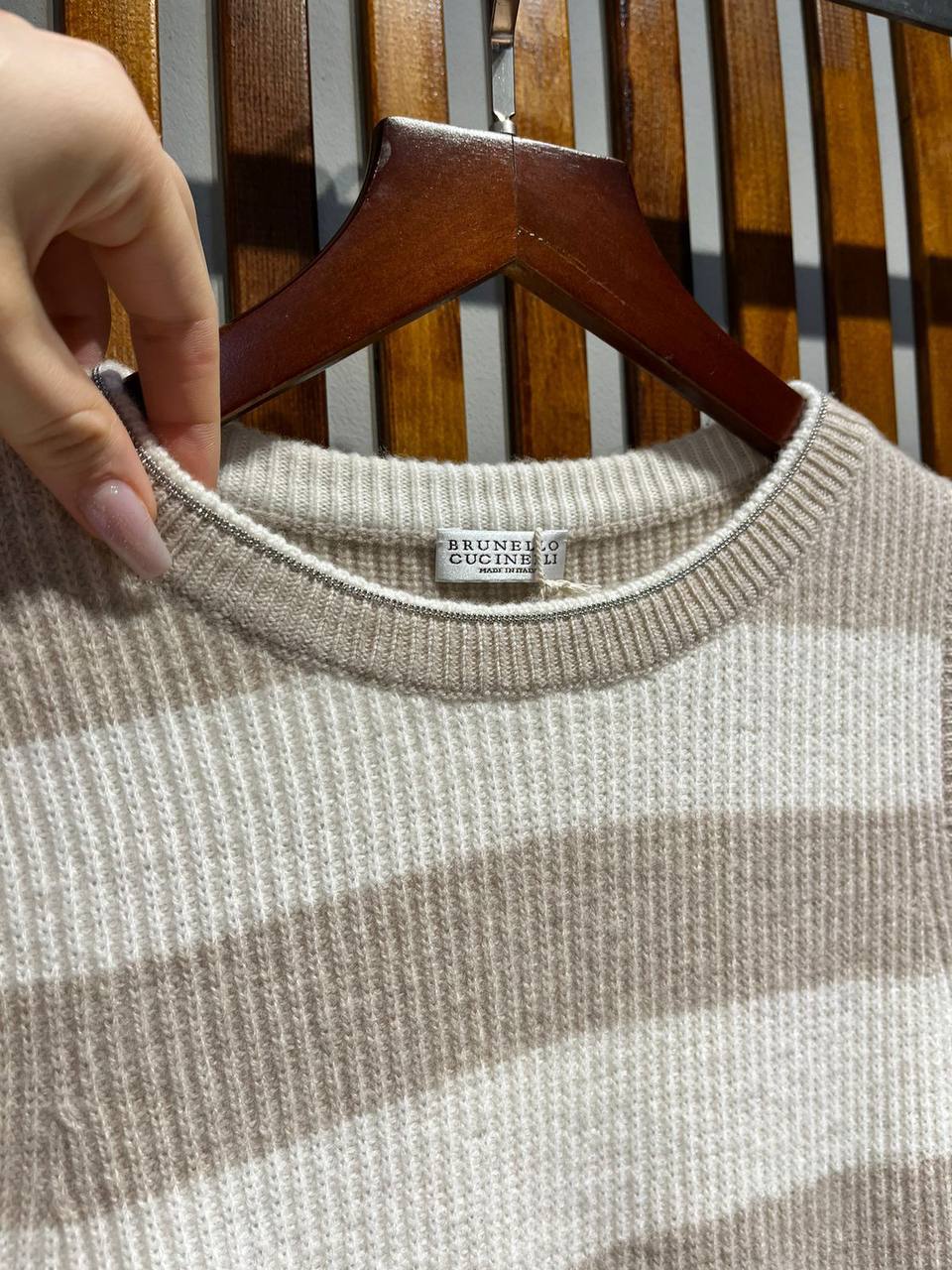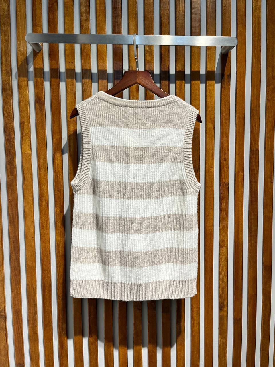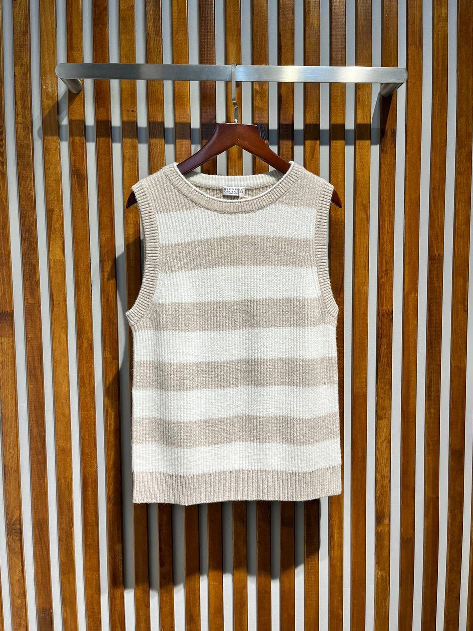 Майка Brunello Cucinelli LUX-94488 — это стильный элемент гардероба. Данный предмет одежды выполнен в бежево-белых полосках, что придает ему современный и привлекательный вид. Подходит для создания различных образов, от повседневных до более формальных.