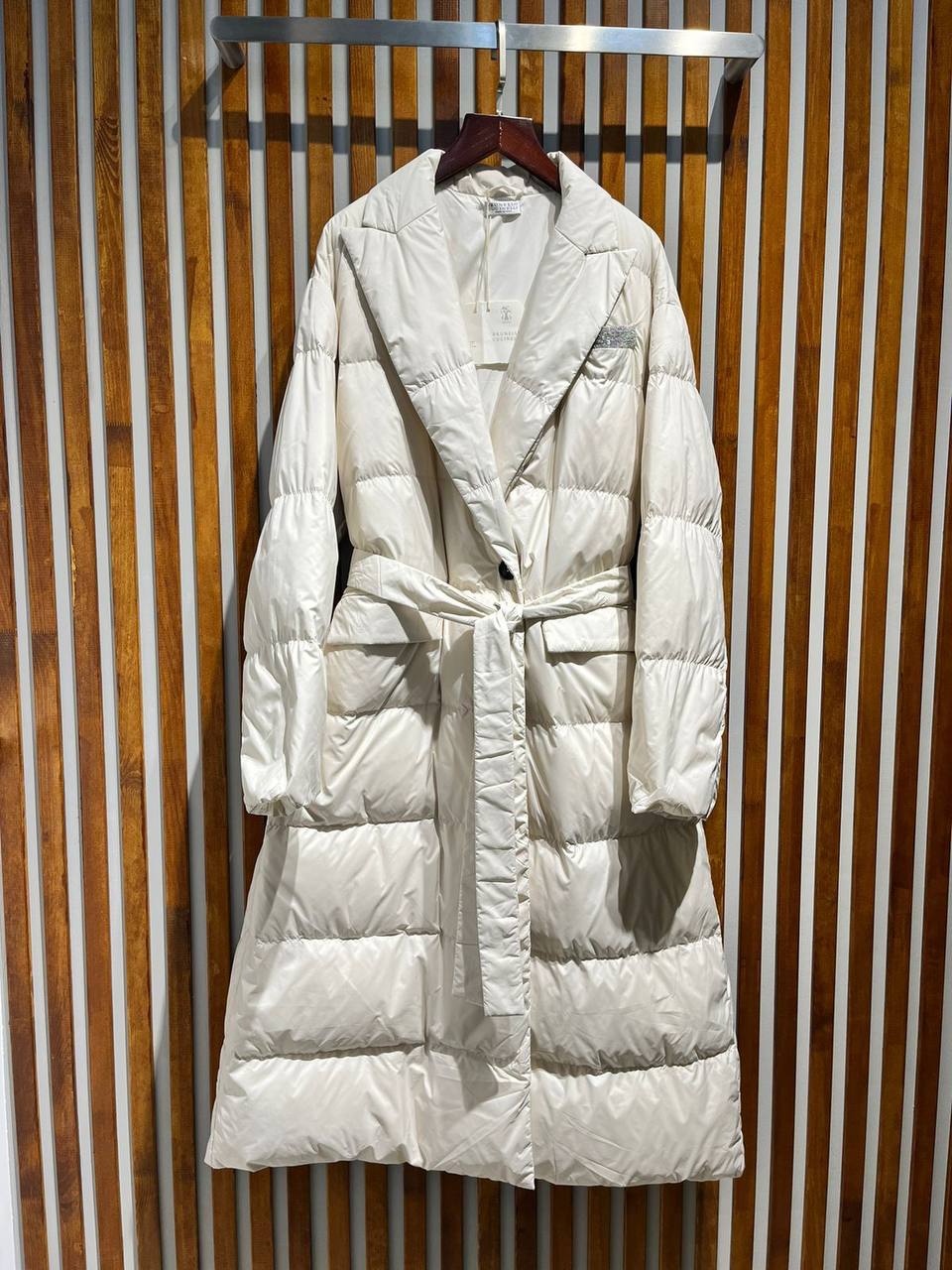 Пальто Brunello Cucinelli LUX-94625 — это элегантное пальто вневременного стиля, выполненное в кремовом оттенке. Его лаконичный дизайн, акцентированный поясом на талии, подчеркивает изысканность образа. Пальто идеально подходит для создания утонченного повседневного или вечернего лука, обеспечивая комфорт и тепло.