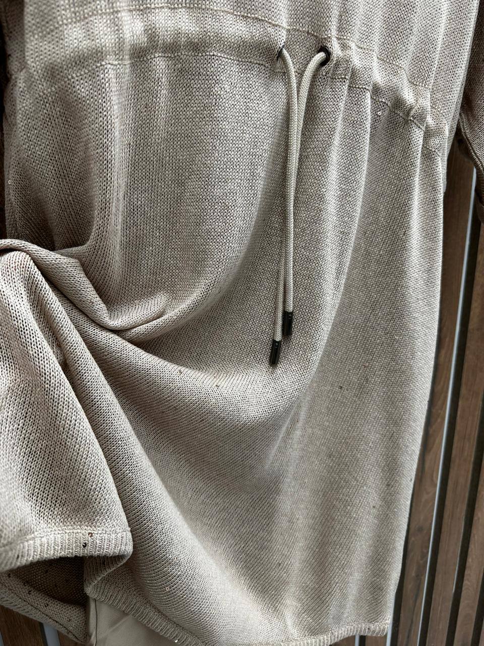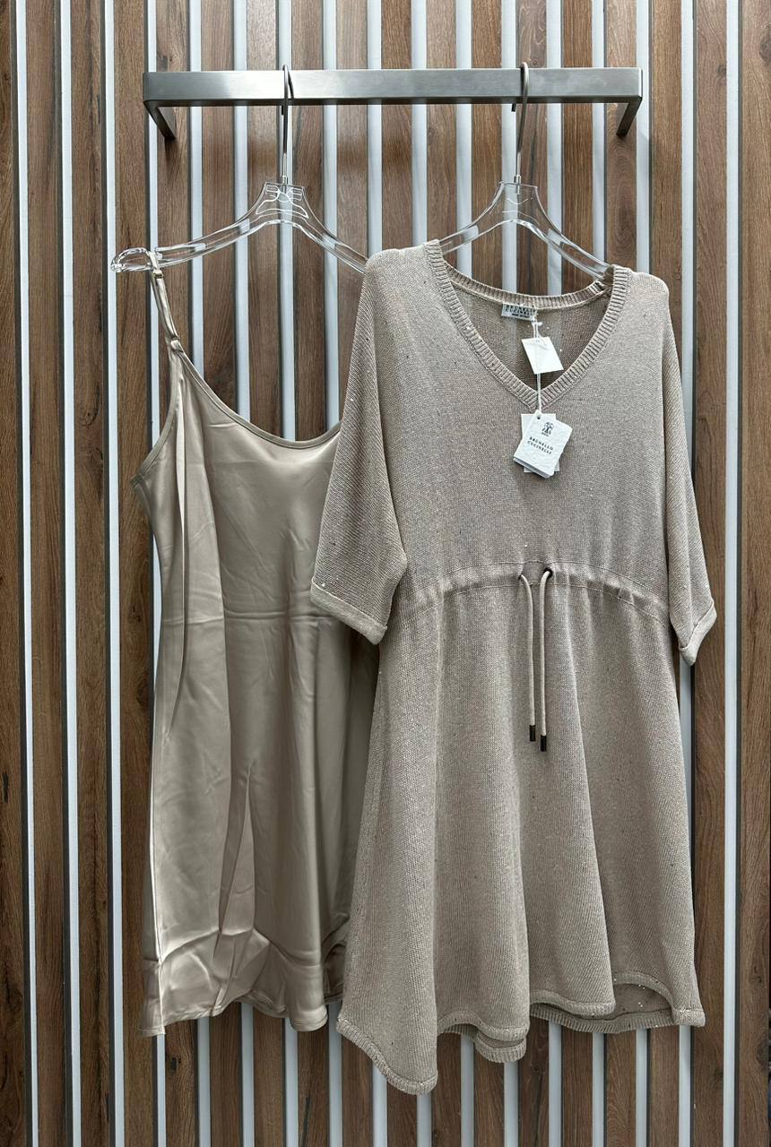 Платье Brunello Cucinelli LUX-92696 выполнено в повседневном стиле. Платье мягкого песочного цвета с V-образным вырезом и короткими рукавами. Текстура ткани хорошо видна, по всей видимости, это трикотаж.