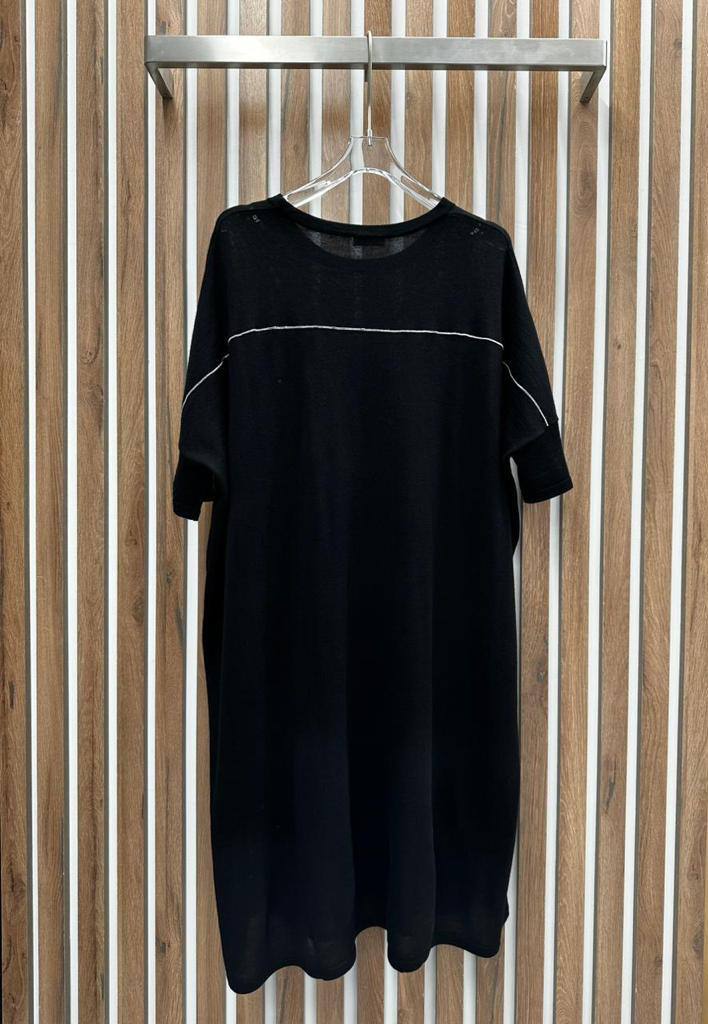 Платье Brunello Cucinelli LUX-95031 - это стильное черное платье, которое воплощает в себе элегантность и комфорт. Модель выполнена в прямом силуэте с короткими рукавами и круглой горловиной, украшенной белой нитью. Платье имеет минималистичный дизайн, что позволяет создавать разнообразные образы.