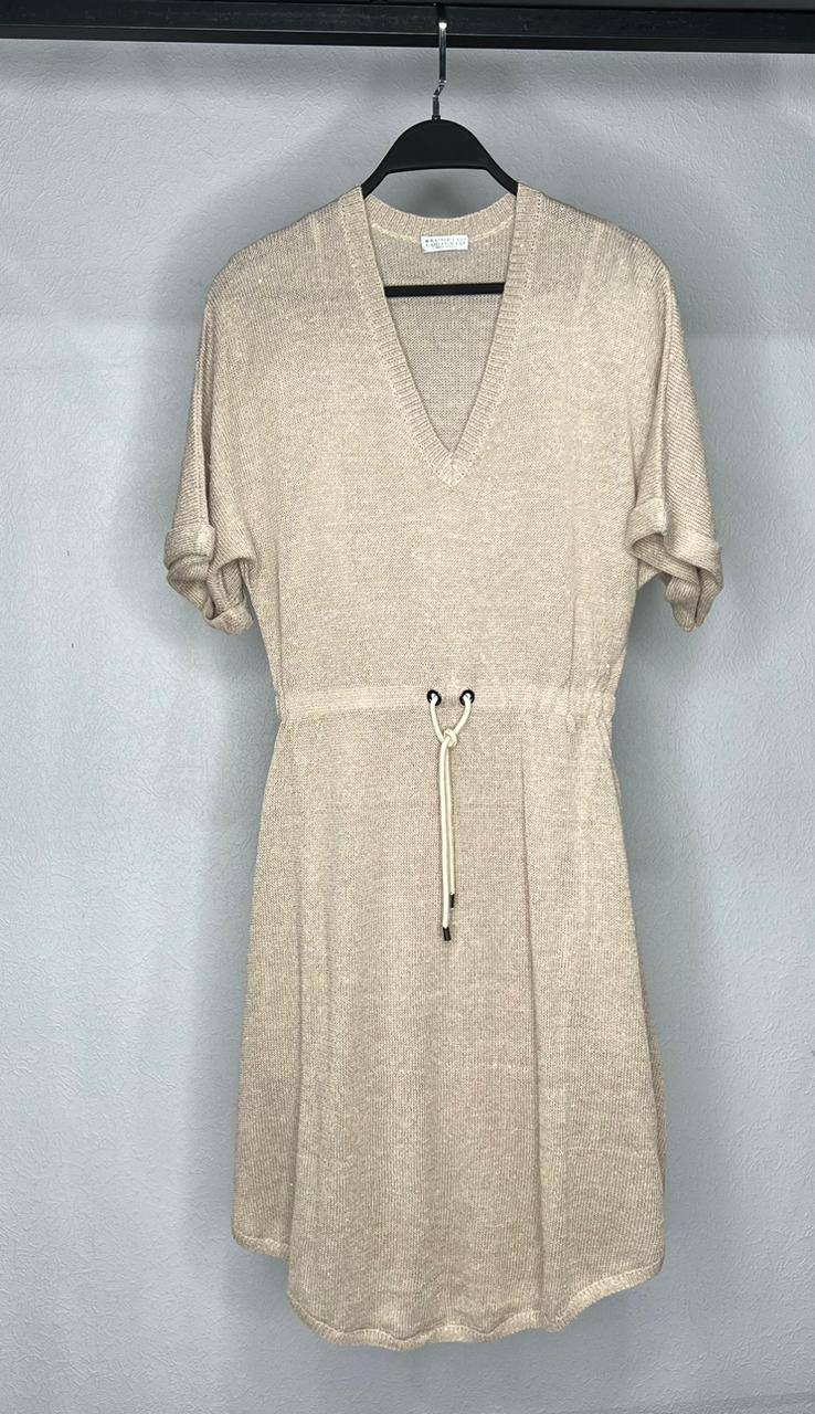 Платье Brunello Cucinelli LUX-104027 представляет собой элегантное платье-свитер в стиле casual. Оно выполнено в нейтральном бежевом оттенке, с V-образным вырезом и короткой рукавами. Платье имеет свободный крой, который подчеркивается шнуровкой на талии, позволяя регулировать посадку по фигуре.