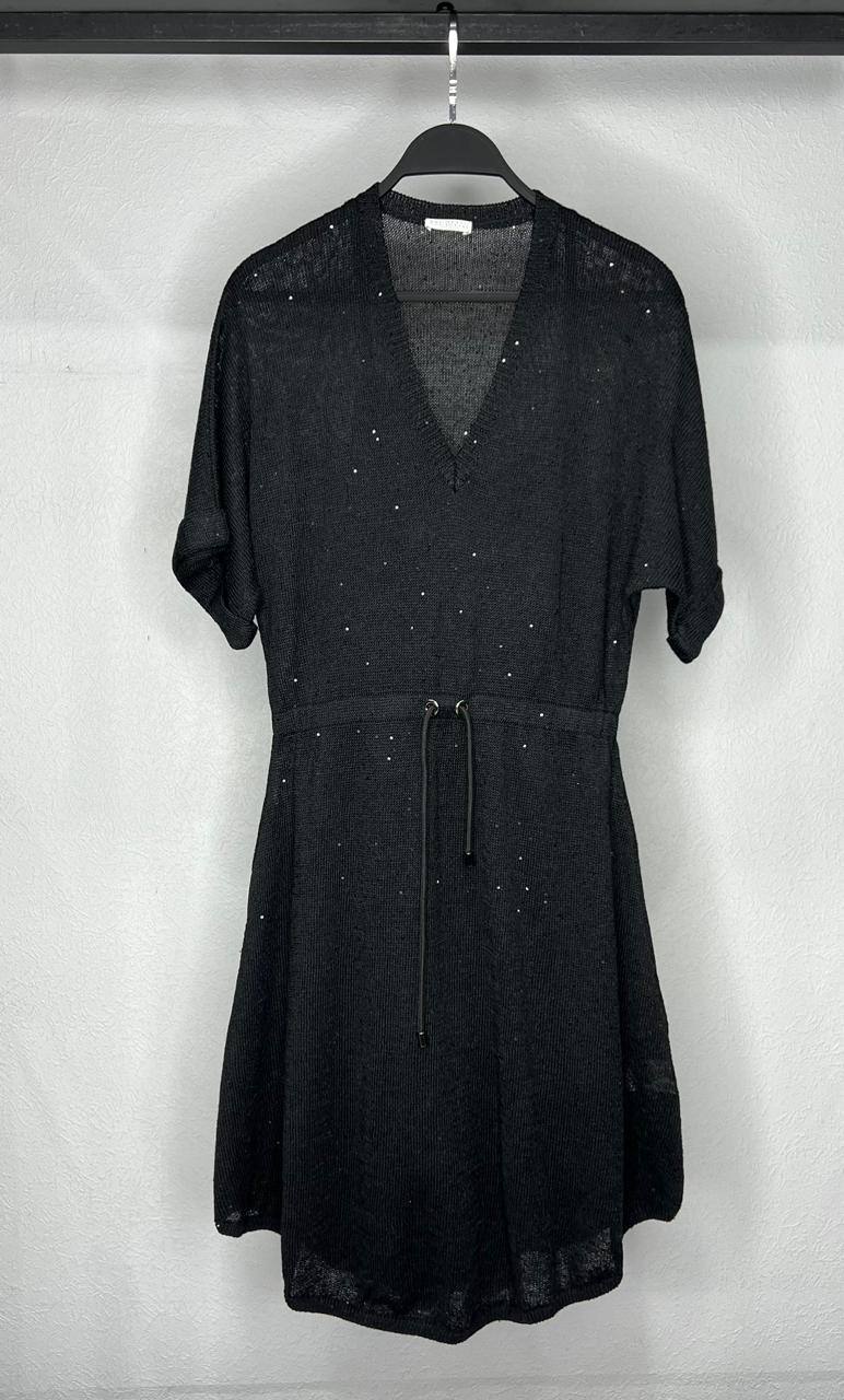 Платье Brunello Cucinelli LUX-104028 — это элегантное платье черного цвета, выполненное в стиле кэжуал. Платье имеет V-образный вырез, короткие рукава и завязки на талии, которые позволяют регулировать посадку. Текстура ткани создает интересный визуальный эффект. Это платье подойдет для различных мероприятий, от повседневных встреч до более формальных.