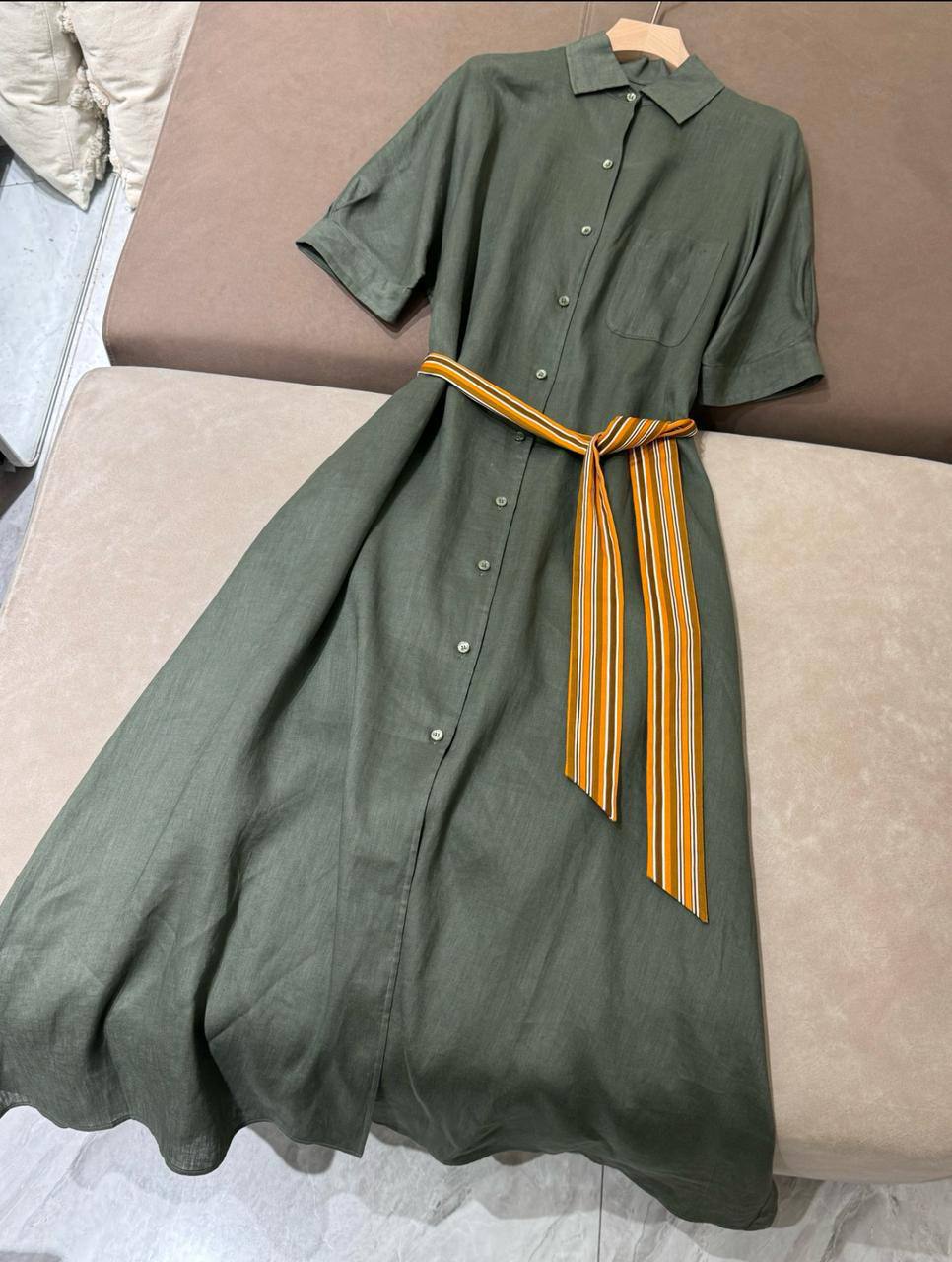 Платье Loro Piana LUX-118032 – это элегантное платье-рубашка оливкового цвета, которое идеально подойдет для создания стильного образа. Платье дополнено контрастным поясом в полоску, который подчеркивает талию и придает образу изюминку. Платье имеет простой и современный крой, подходящее для различных ситуаций.