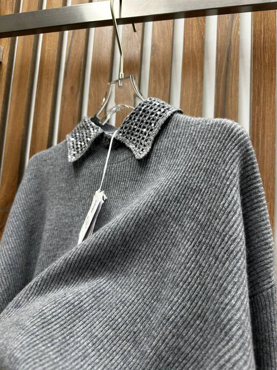 Поло Brunello Cucinelli LUX-111302 представляет собой элегантный свитер с воротником, который подходит как для повседневной носки, так и для особых случаев. Изделие выполнено в сером цвете, что придает ему универсальность и легкость в сочетании с другими предметами гардероба. Текстура свитера выглядит мягкой и приятной на ощупь.