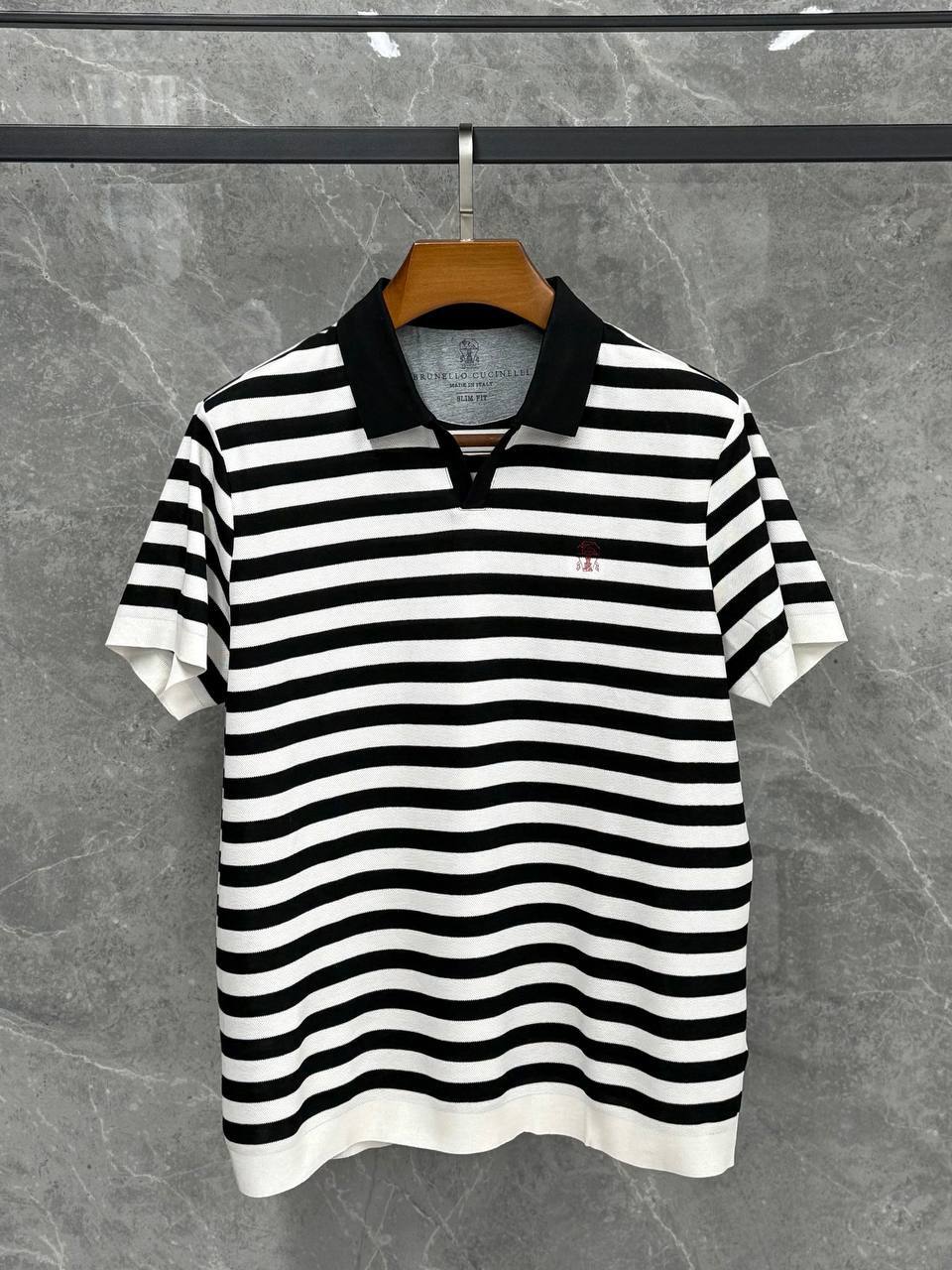 Поло Brunello Cucinelli LUX-118002 представляет собой стильную полоску в черно-белую полоску, сочетающую в себе элегантность и повседневный стиль. Этот предмет гардероба с классическим дизайном и комфортной посадкой идеально подходит для создания различных образов. Поло можно использовать как для повседневной носки, так и для более формальных мероприятий.