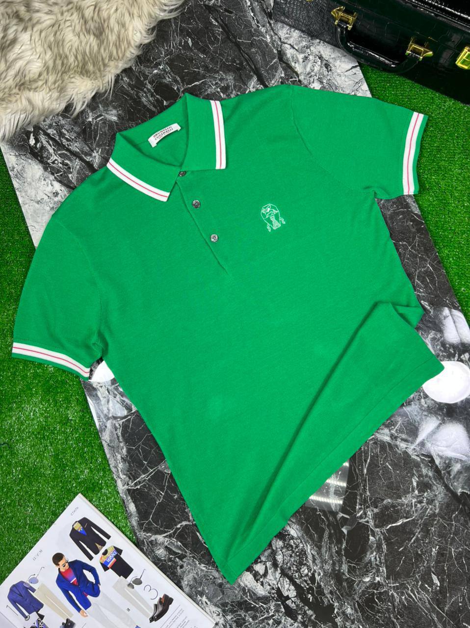 Это мужское поло Brunello Cucinelli LUX-68451 яркого зеленого цвета, выполненное в классическом стиле. Поло имеет воротник с контрастными полосами и небольшой вышитый логотип на груди. Стиль одежды идеально подходит для создания элегантных и непринужденных образов, сочетая в себе комфорт и утонченность.