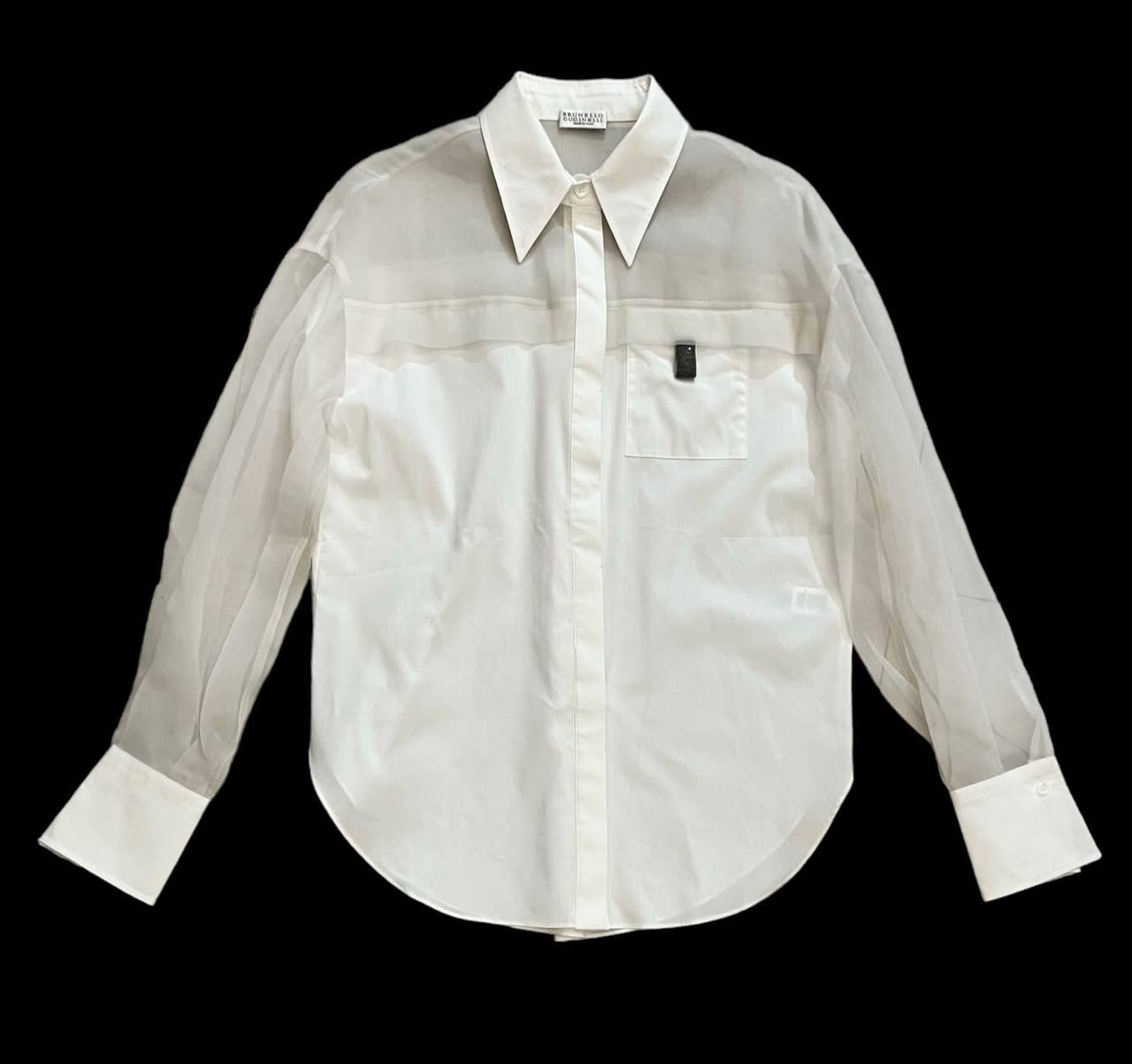 Рубашка Brunello Cucinelli LUX-89135 — воплощение элегантности и изысканности. Белая рубашка свободного кроя, выполненная в классическом стиле, сочетает в себе прозрачные детали на рукавах и плечах, что придает ей легкость и воздушность. Идеально подходит для создания утонченных образов.