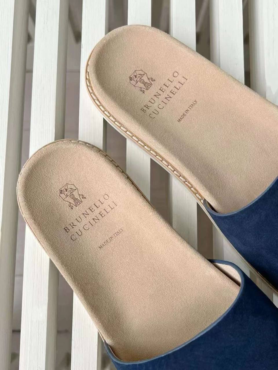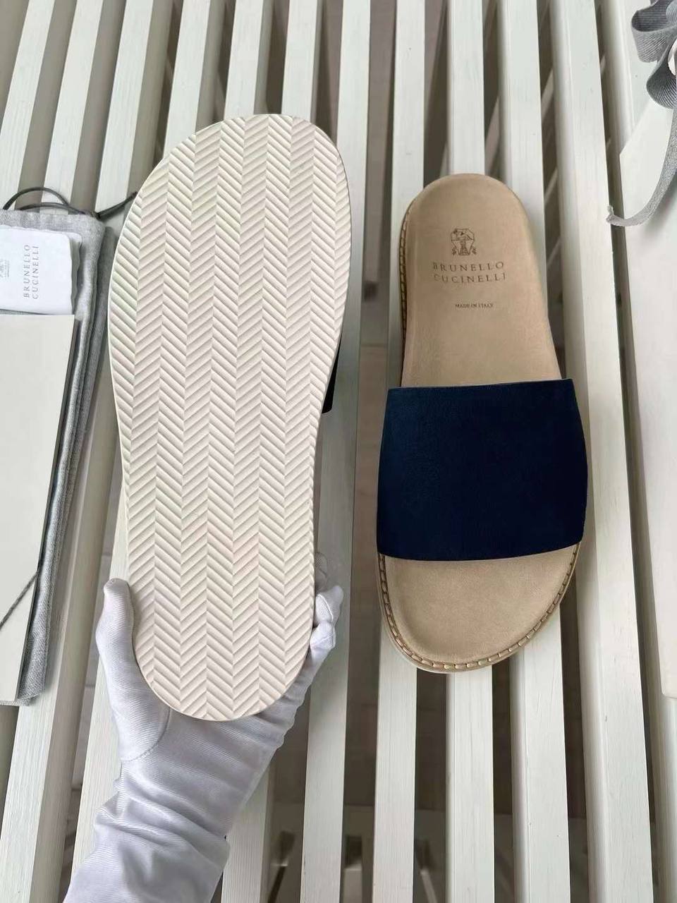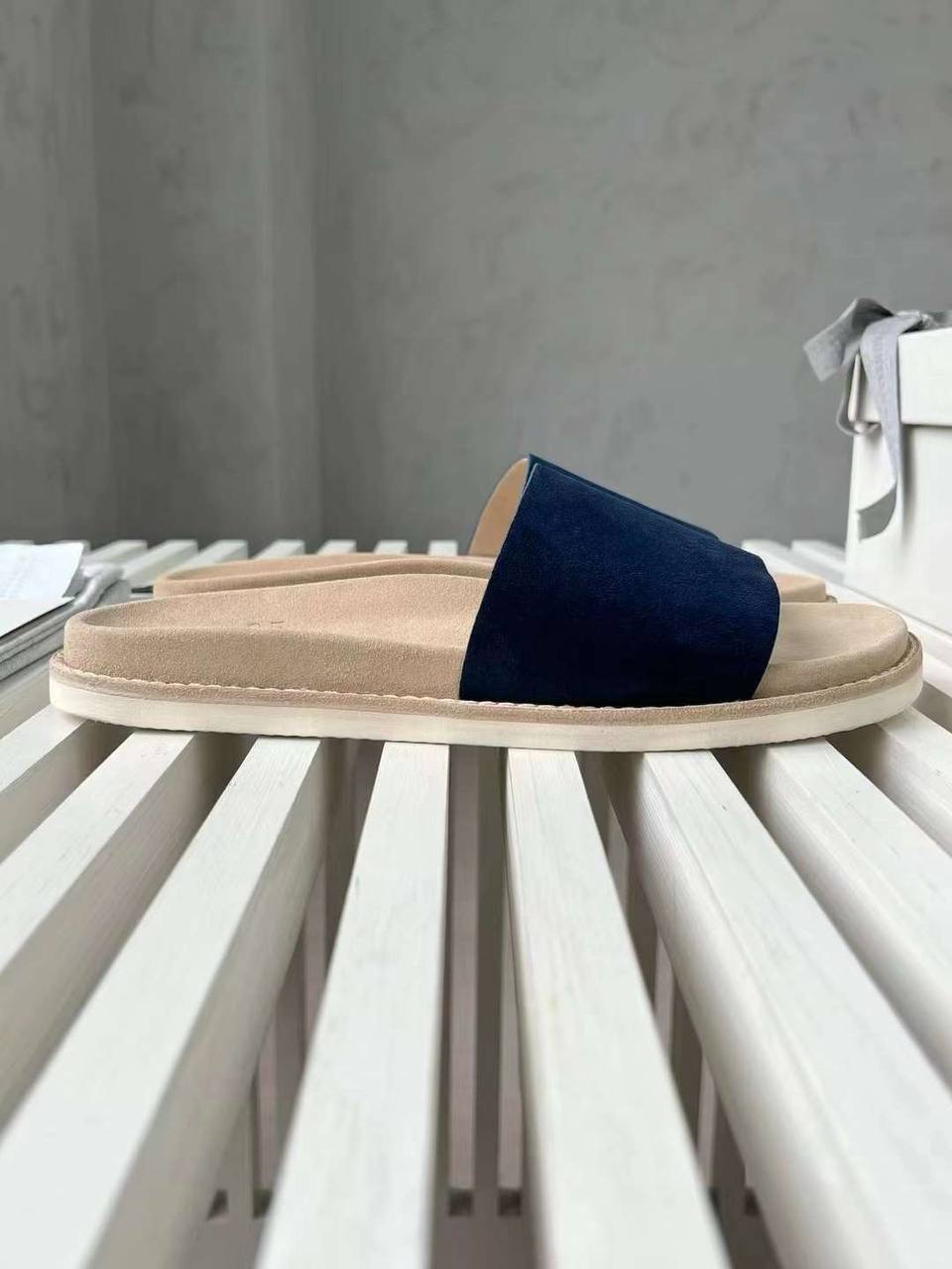 Шлепанцы Brunello Cucinelli LUX-107762 — воплощение летнего комфорта и элегантности. Шлепанцы выполнены в минималистичном стиле, имеют темно-синий верх и бежевую стельку. Такая цветовая гамма позволяет легко сочетать их с различными летними нарядами.
