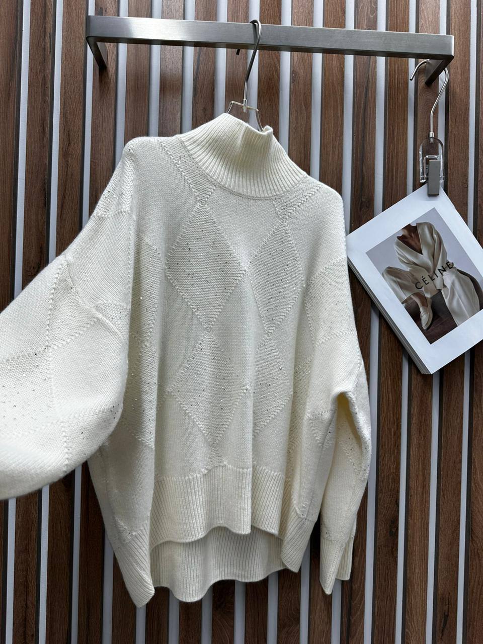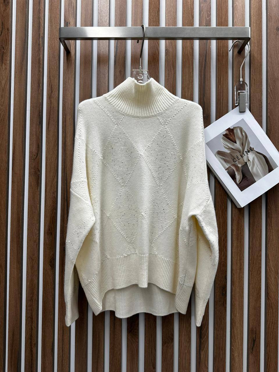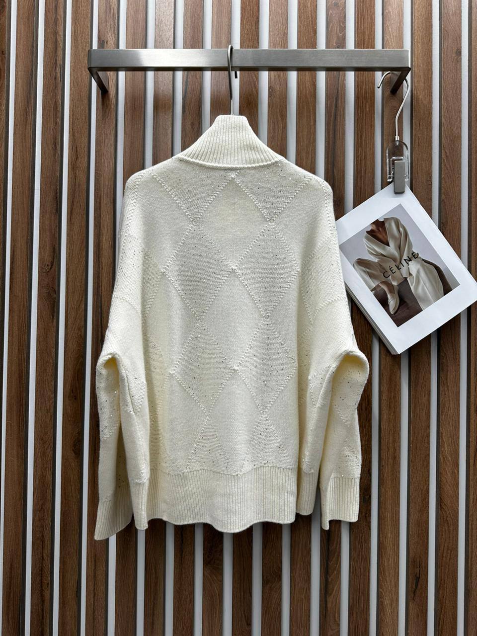 Свитер Brunello Cucinelli, артикул LUX-109737, представляет собой элегантный предмет гардероба в стиле casual. Свитер кремового цвета с текстурированным ромбовидным узором и высоким воротником. Он идеально подходит для создания стильного и комфортного образа в прохладную погоду.