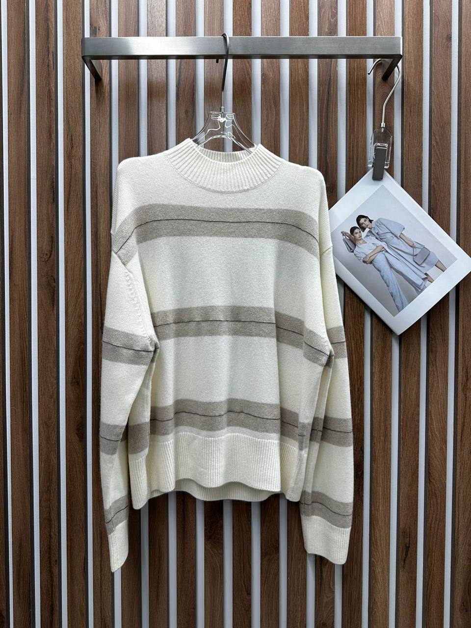 Свитер Brunello Cucinelli LUX-110251 - это стильный предмет гардероба, выполненный в классическом стиле. Свитер выполнен в кремовых тонах с горизонтальными полосами серого цвета, что придает ему элегантный вид. Этот свитер идеально подойдет для создания повседневных образов.