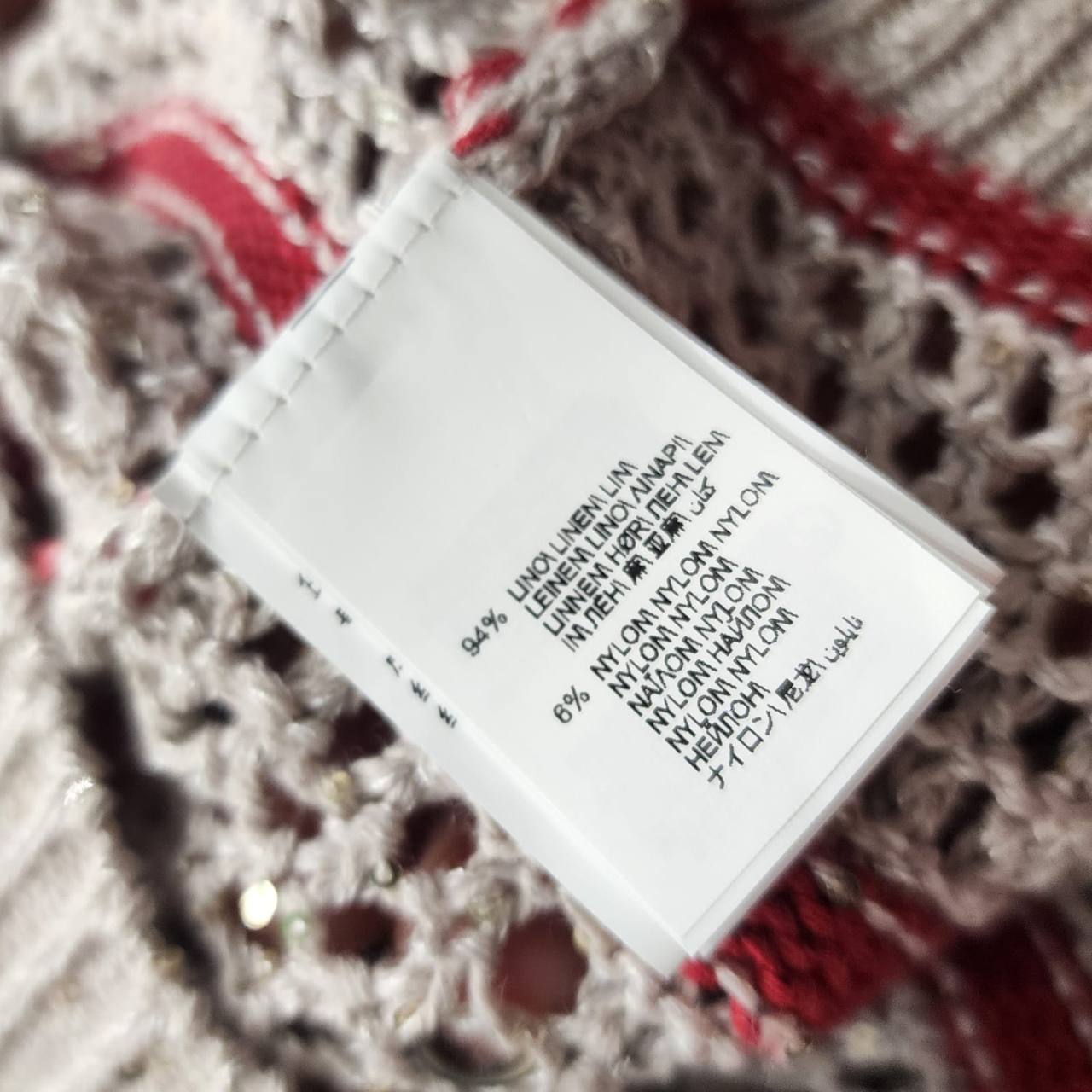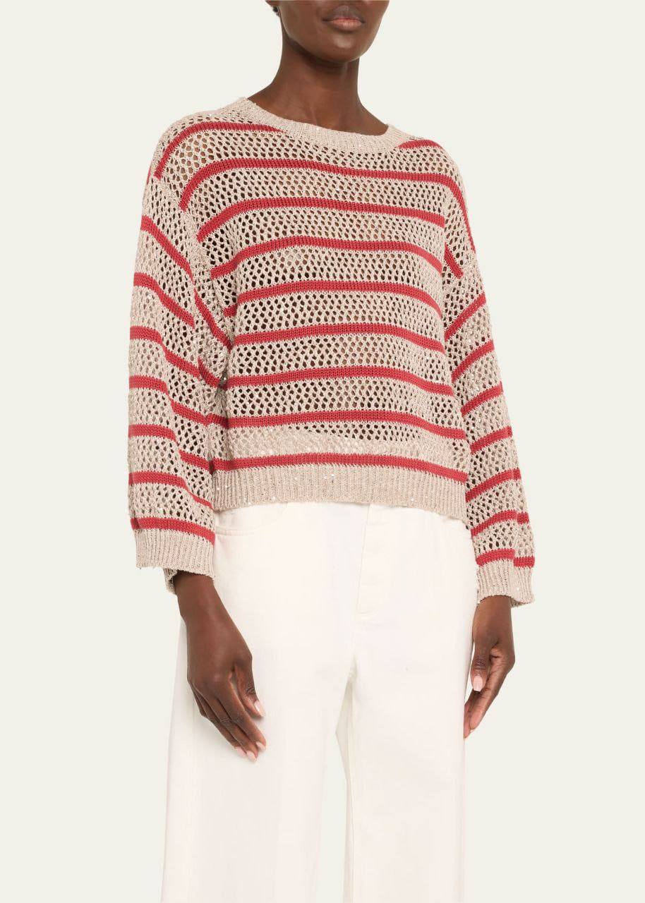 Свитер Brunello Cucinelli LUX-116682 – это стильный предмет гардероба, выполненный в повседневном стиле. Свитер имеет бежевый цвет с красными горизонтальными полосами, создающими яркий акцент. Текстура свитера предполагает плетение, что придает изделию легкость и воздушность.