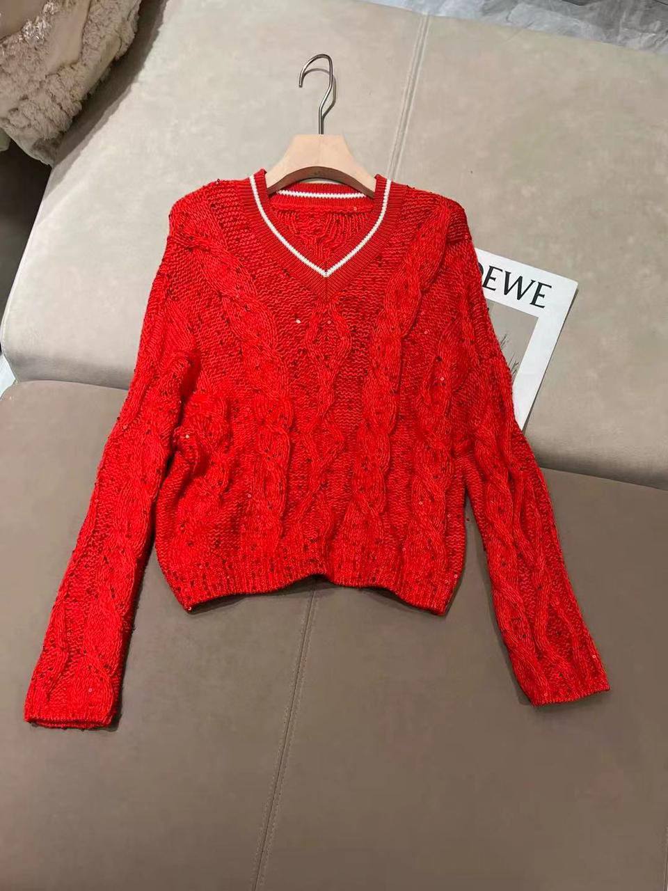 Brunello Cucinelli представляет вязаный свитер с V-образным вырезом, выделяющийся своим ярким цветом и оригинальным плетением. Эта модель станет стильным дополнением к вашему гардеробу.