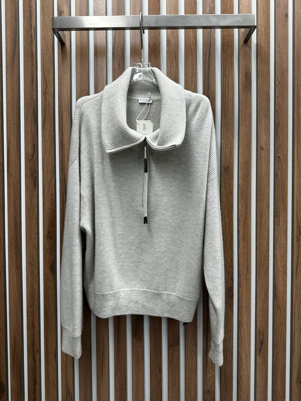 Женский свитер Brunello Cucinelli (артикул LUX-96607) представляет собой элегантную модель серого цвета с высоким воротником и молнией. Свитер выполнен в классическом стиле, что делает его универсальным для различных образов. Текстура изделия выглядит мягкой и приятной на ощупь.
