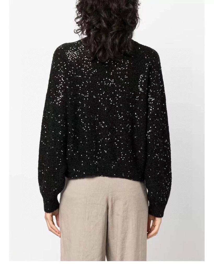 Женский свитер Brunello Cucinelli (артикул LUX-100429) представляет собой стильный предмет гардероба. Свитер выполнен в черном цвете с блестками, которые создают эффектный мерцающий вид. V-образный вырез горловины добавляет изделию женственности и элегантности.