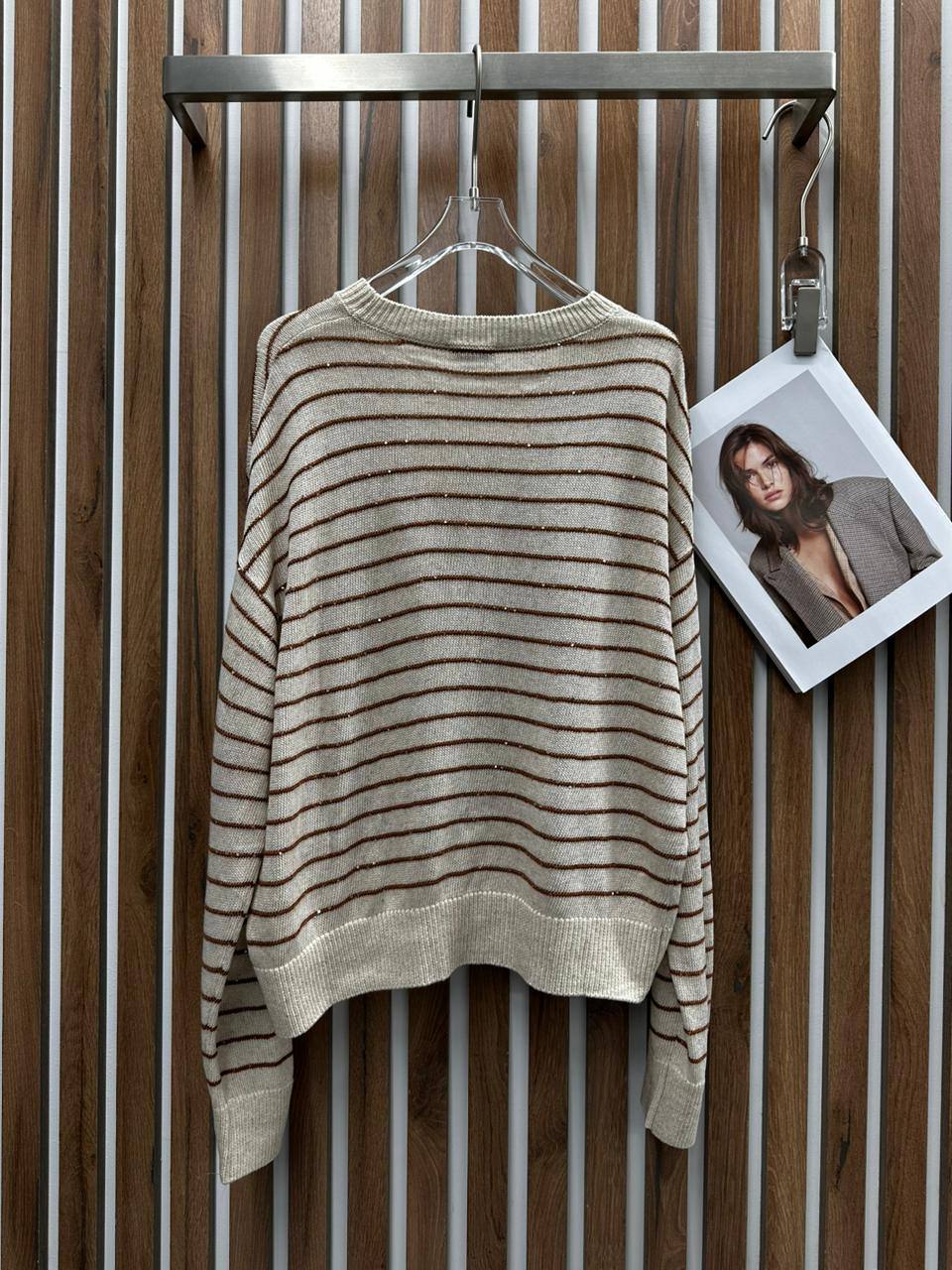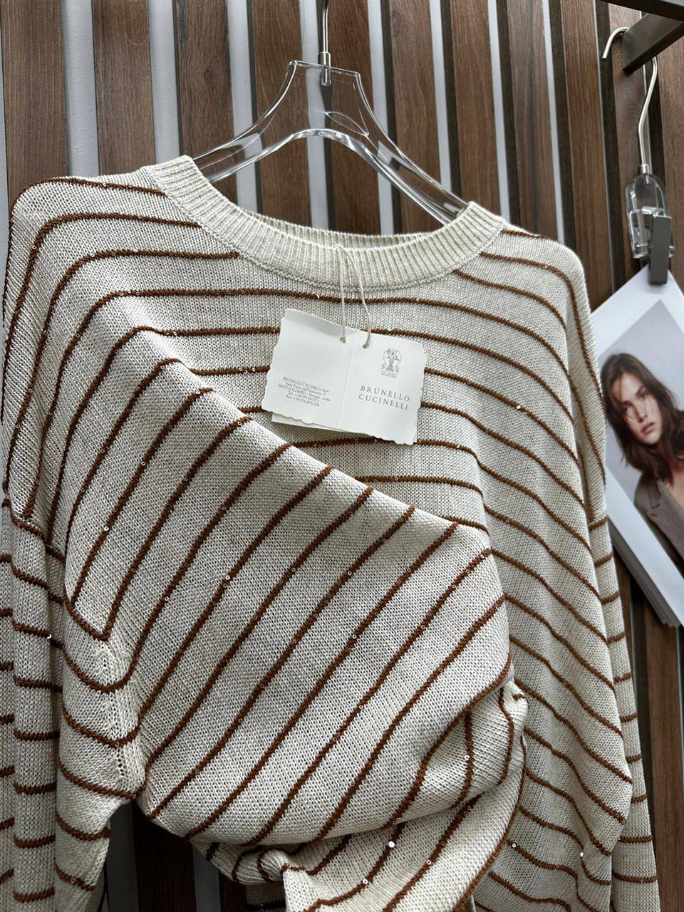 Свитер женский Brunello Cucinelli, артикул LUX-109150, представляет собой стильный и элегантный предмет гардероба. Свитер выполнен в классическом стиле, его дизайн дополняют горизонтальные полосы коричневого цвета. Он идеально подходит для повседневной носки, добавляя образу нотку изысканности и комфорта.