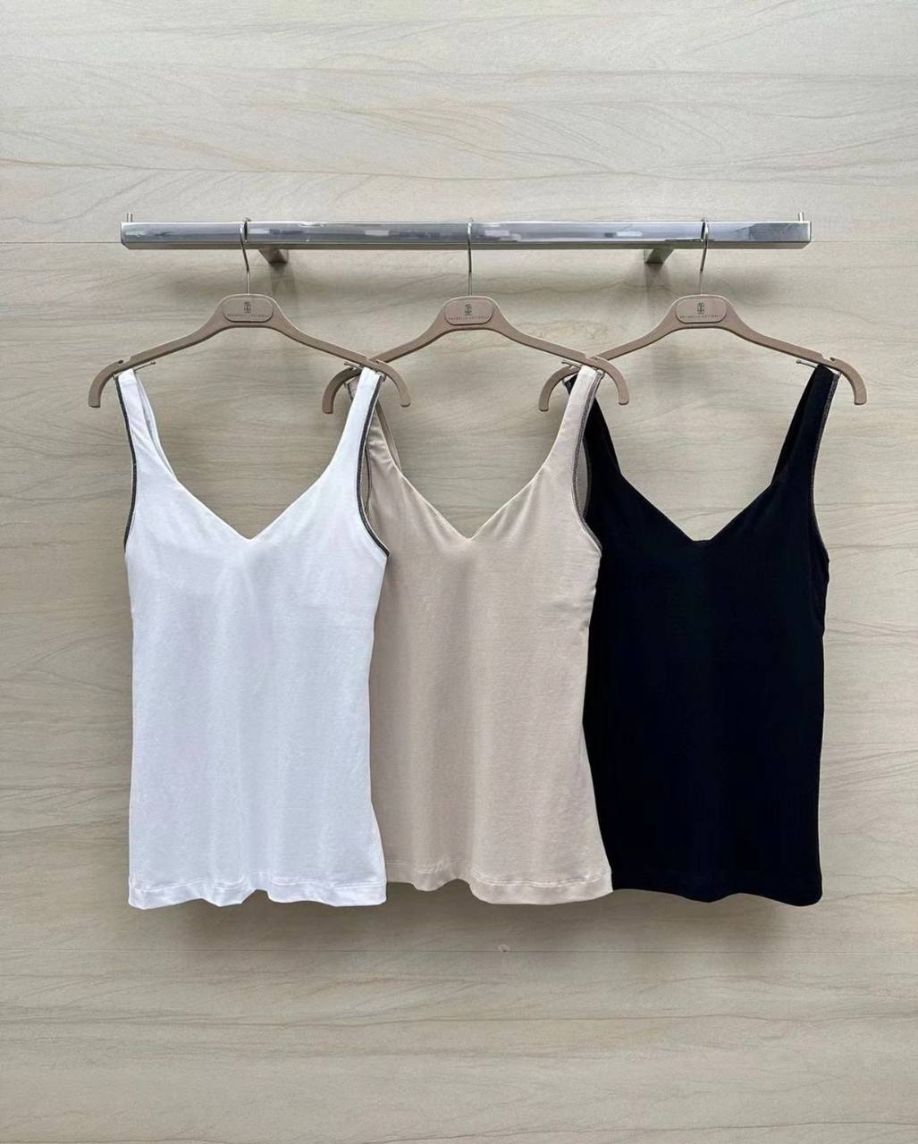 Топ Brunello Cucinelli LUX-106975 представлен в виде базового топа с V-образным вырезом, выполненного в классическом стиле. На картинке топ предлагается в трех цветах: белом, бежевом и черном. Данный топ, благодаря своему минималистичному дизайну, идеально подходит для создания различных образов.