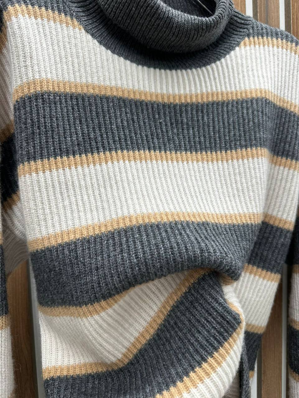 Водолазка Brunello Cucinelli LUX-99038 — это стильный элемент гардероба. Водолазка выполнена в полосатом дизайне, сочетающем различные оттенки серого, белого и горчичного цветов. Модель предназначена для создания повседневных и элегантных образов.