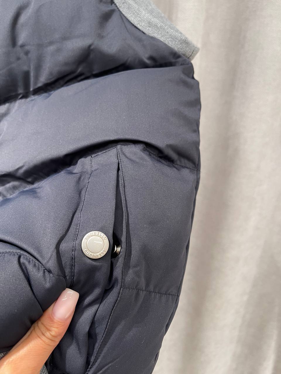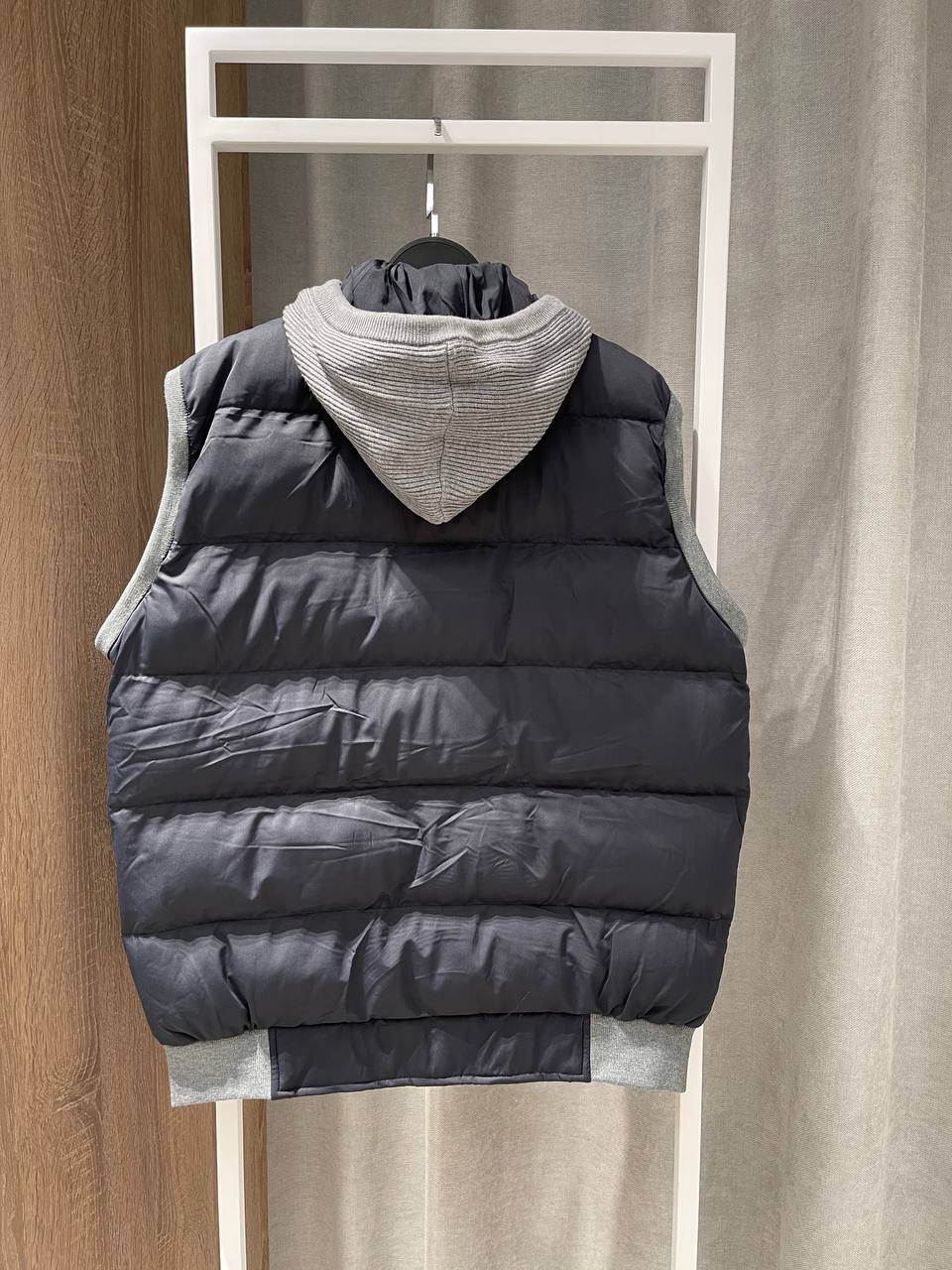 Мужской жилет Brunello Cucinelli — стильный и практичный элемент гардероба для прохладной погоды. Модель выполнена в темно-синем цвете с серыми вставками, имеет капюшон и застегивается на кнопки.