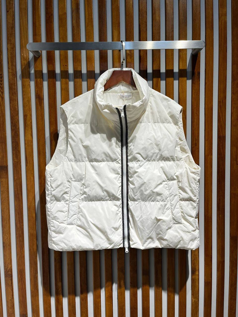 Жилет Brunello Cucinelli LUX-93737 - это стильный жилет в классическом стиле, выполненный в кремовом оттенке. Жилет обладает стеганой текстурой и воротником-стойкой, что делает его идеальным выбором для создания многослойных образов в прохладную погоду.